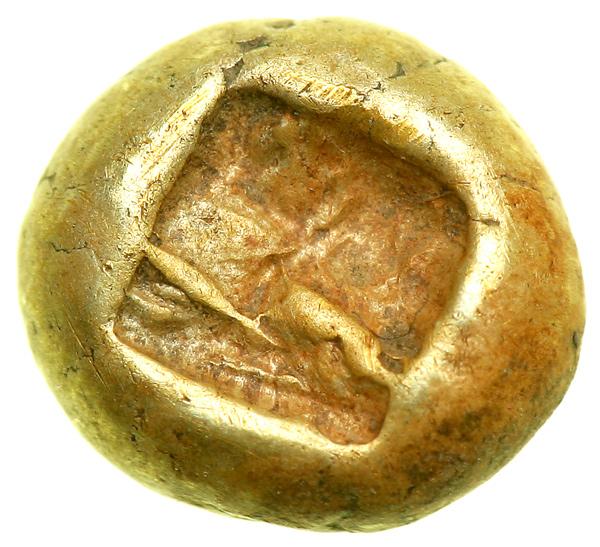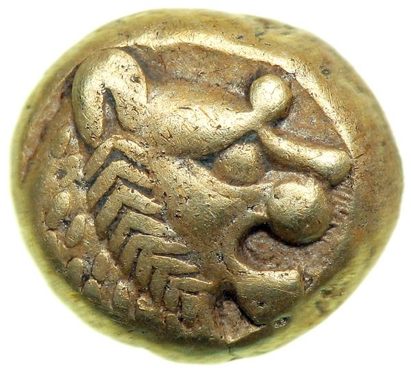 Kingdom of Lydia. Time of Alyattes to Kroisos, c. 600-560 BC. Electrum Hemihekte (or 1/12 Stater; 1.18 g). Lion's head right, with globular wart on nose. Reverse: Incuse square. Weidauer group XV, 79-85; Rosen 654; Boston MFA 1770; Dewing 2424-5. Rare. Beautifully centered and detailed; About Extremely Fine for issue.