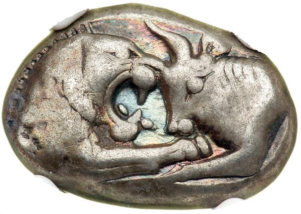 Kingdom of Lydia, c. 550 BC or later. AR Siglos (of Half-Stater; 5.27 g). Foreparts of lion and bull, facing each other. Reverse: Two incuse squares. Dewing 2428; BMC 45. Toned. NGC graded Ch F; Strike 5/5; Surface 3/5; banker's mark on edge.