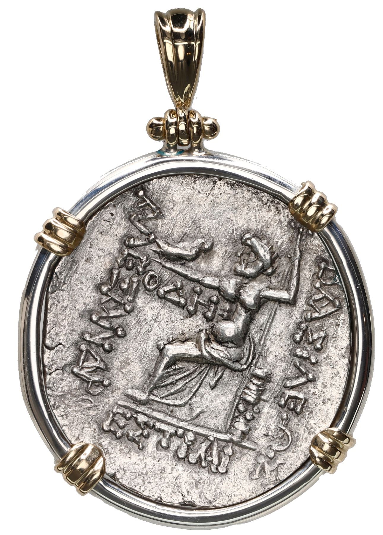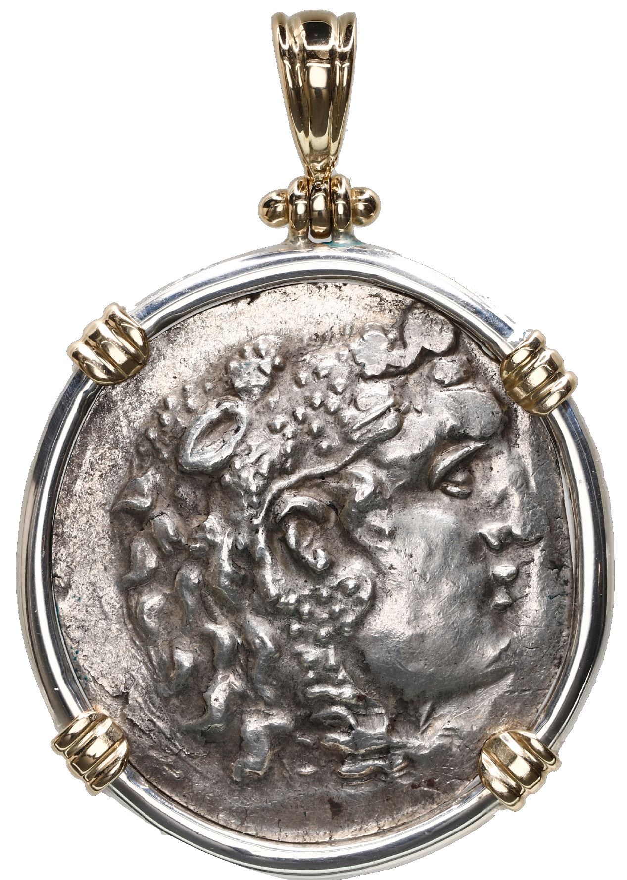 Kingdom of Macedon, AR tetradrachm, Alexander III (the Great), 336-323 BC, mounted head-side out in thick silver bezel with 14K gold prongs and shackle bail. 24.29 grams total. Head of Herakles right, wearing lion's skin headdress / Zeus seated left, holding eagle in right hand, sceptre in left. Attractive blend of gold and silver in bezel, VF coin with a few small bits of porosity on obverse. With photo-certificate.