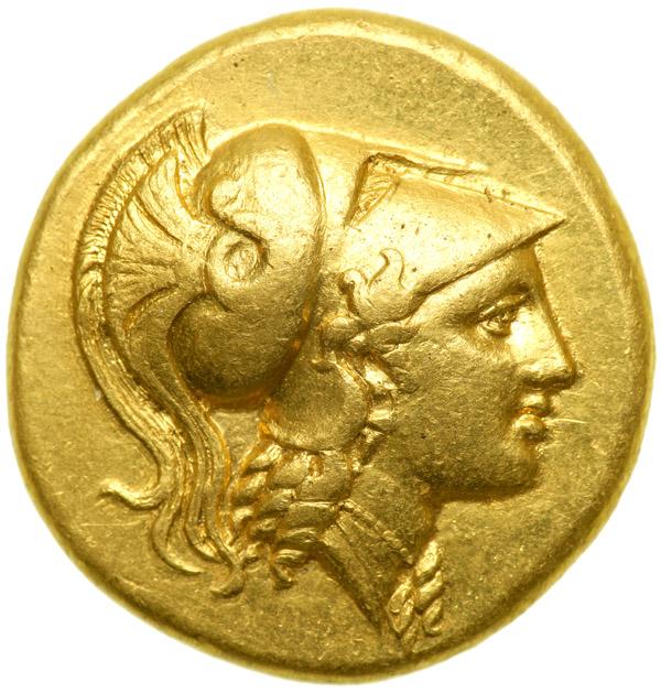 Kingdom of Macedon. Alexander III, the Great, 336-323 BC. Gold Distater (17.12 g) minted in Macedon, likely at Aegeae, lifetime issue of c. 336-323 BC. Head right of Athena wearing triple-crested helmet, decorated with snake. Reverse: Nike standing left, holding wreath and stylis; in left field, thunderbolt; under her right wing, monogram. Price 191; Müller 5; SNG Cop 623; Dewing 1134. A few light, insignificant nicks at bottom of reverse. Luster remaining in devices. Very Fine to Extremely Fine. .