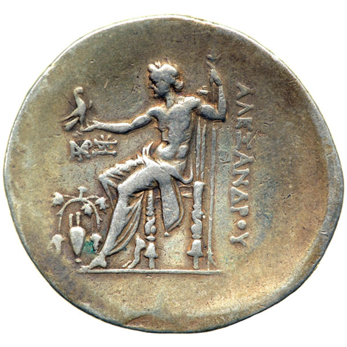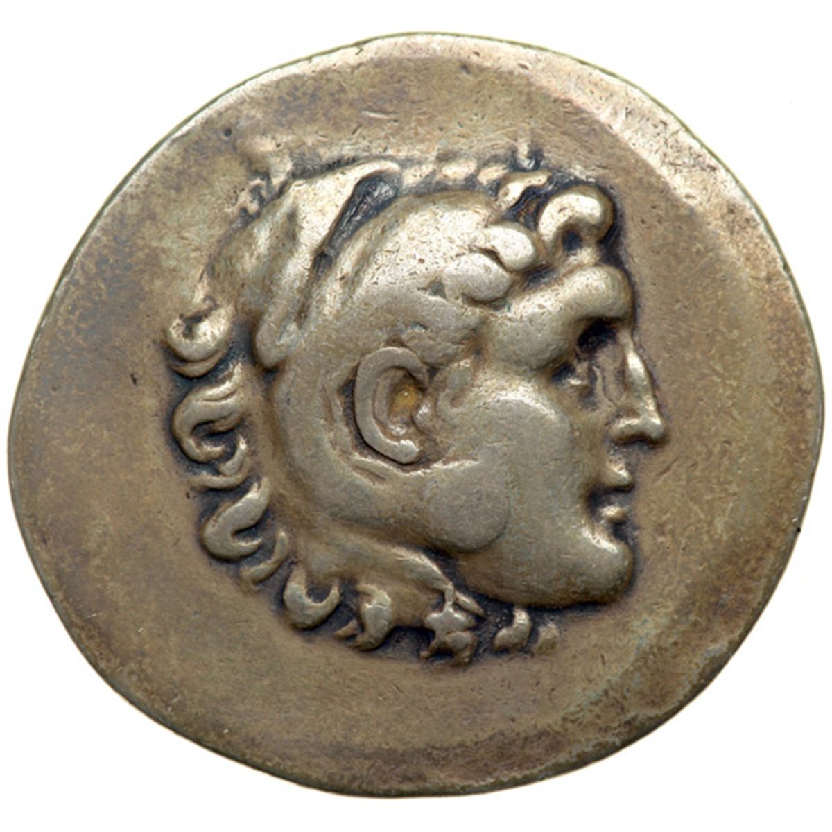 Kingdom of Macedon. Alexander III, the Great, 336-323 BC. AR Tetradrachm (16.33 g) minted posthumously at Temnos, c. 188-170 BC. Head right of Herakles, wearing lion's skin headdress. Reverse: Zeus enthroned left, holding eagle and scepter; in left field, two monograms; in lower left field, one-handled amphora with grape and leaf tendril around. Cf. Price 1687 (same monograms, only in right field). Struck on a medallic flan, 39.50 mm in diameter. A very attractive example of this late Hellenistic issue. Very Fine.