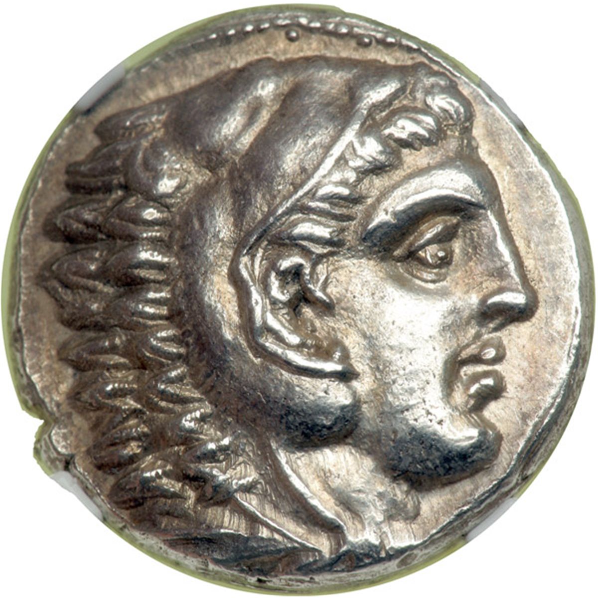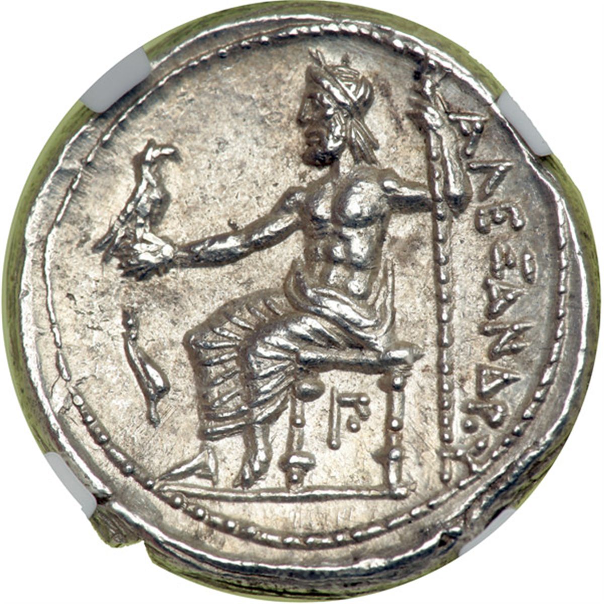 Kingdom of Macedon. Alexander III, the Great, 336-323 BC. AR Tetradrachm (17.22 g) minted posthumously, likely at Amphipolis, c. 320-317 BC. Head right of Herakles wearing lion's skin headdress. Reverse: Zeus enthroned left, holding eagle and scepter; in left field, dolphin downwards; under throne, monogram. Price 133; M. 542. Luster mainly confined to reverse. NGC graded Ch AU Star; Strike 5/5; Surface 5/5.