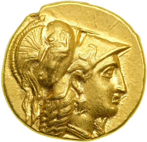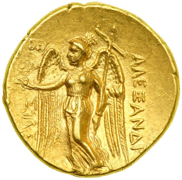 Kingdom of Macedon. Alexander III, the Great, 336-323 BC. Gold Stater (8.62 g) probably minted in the East. Head right of Athena wearing triple-crested helmet, decorated with springing griffin. Reverse: Nike standing left, holding wreath and stylis. Reverse is a bit double struck and centered towards 6 o'clock, so mint attribution is not possible. Lustrous; Extremely Fine or better.