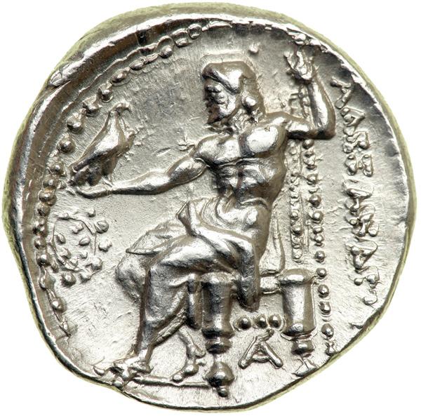 Kingdom of Macedon. Alexander III, the Great, 336-323 BC. AR Tetradrachm (16.63 g) minted posthumously at an uncertain mint in Phoenicia or Syria. Head right of Herakles, wearing lion's skin headdress. Reverse: Zeus enthroned left, holding eagle and scepter; in left field, wreath; under throne, monogram with three pellets. Price -- (cf. Price 3566-7). Lustrous, Superb Extremely Fine.