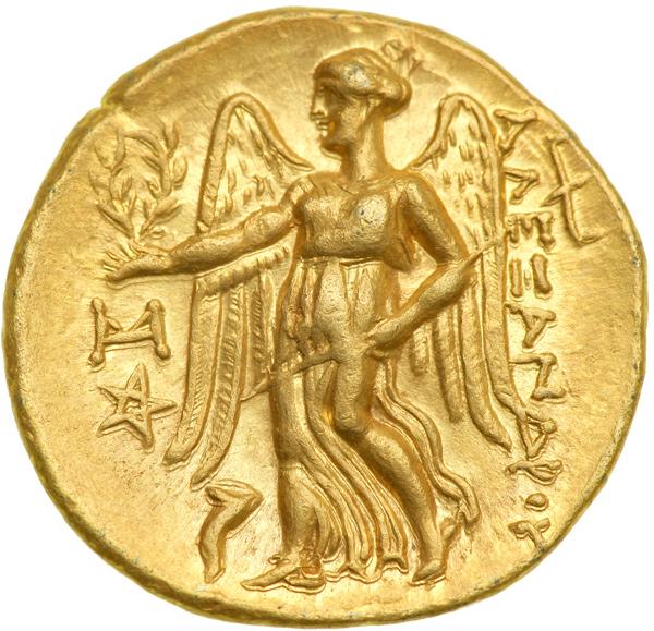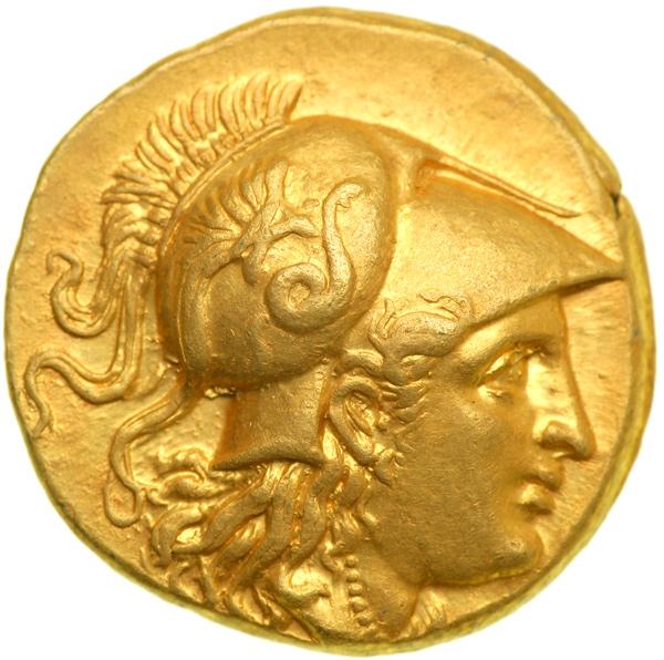 Kingdom of Macedon. Alexander III, the Great, 336-323 BC. Gold Stater (8.49 g) minted at Abydos under Philip III, c. 318/7 BC. Head right of Athena wearing triple-crested helmet decorated with snake. Reverse: Nike standing left, holding wreath and stylis; to left, monogram, star and cornucopiae. Price 1524v; M. 381v. Struck in high relief; lustrous and Superb Extremely Fine. .