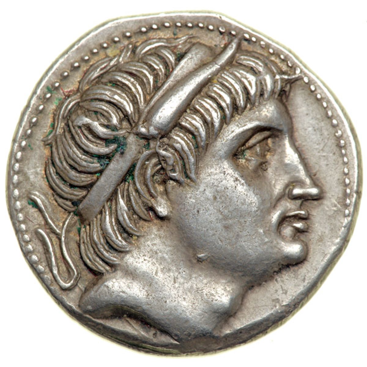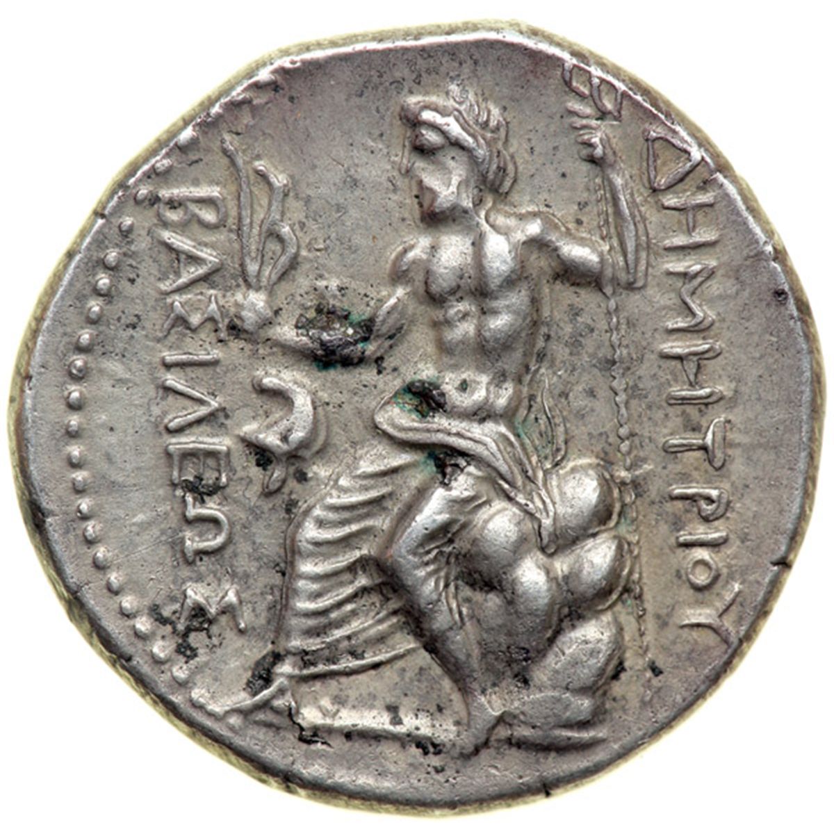Kingdom of Macedon. Demetrios Poliorketes, 306-283 BC. AR Tetradrachm (17.11 g) minted in Macedon (possibly Amphipolis) c. 291-290 BC. Diademed head right of Demetrios Poliorketes, wearing bull's horn. Reverse: Poseidon seated left on a rock; he holds aplustre and trident; in central left field, Phrygian helmet. Newell (The Coinages of Demetrius Poliorcetes) 136 (plate XIV, 3). Rare. A few spots of encrustations, mainly on the reverse. Outstanding portrait. Extremely Fine. .