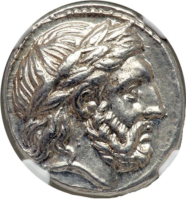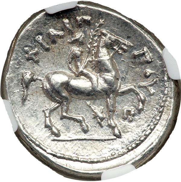 Kingdom of Macedon. Philip II, 359-336 BC. AR Tetradrachm (14.35g). Laureate head right of Zeus. Reverse: Youth on horseback right holding palm; in lower field, dolphin. Cf. Le Rider plate 46. Well struck and fully lustrous. NGC graded AU: Strike 5/5; Surface 4/5.