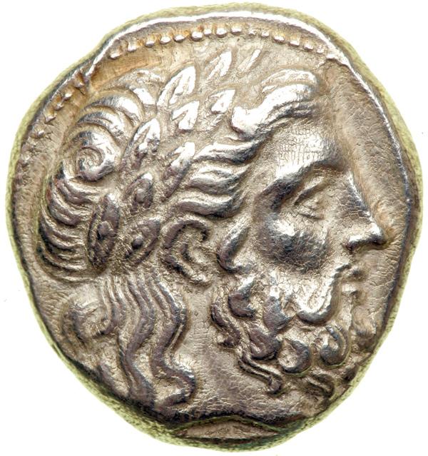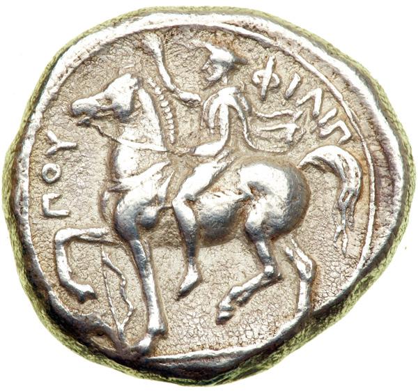 Kingdom of Macedon. Philip II, 359-336 BC. AR Tetradrachm (14.13 g) minted at Amphipolis, c. 356-348 BC. Laureate head right of Zeus. Reverse: Philip, wearing kausia, riding horse pacing left, his right hand raised; in lower left field, bow. Le Rider 155 (this obverse die). Perfectly centered on an ideally shaped flan for types. Extremely Fine; slight reverse porosity. .