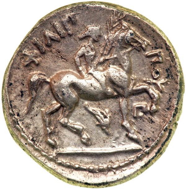Kingdom of Macedon. Philip II, 359-336 BC. AR Tetradrachm minted at Amphipolis, c. 323-315 BC. Laureate head right of Zeus. Reverse: Youth on horseback right, holding palm; below horse, dolphin and control letter. Cf. Le Rider pl. 46, 19. ICG graded EF45.