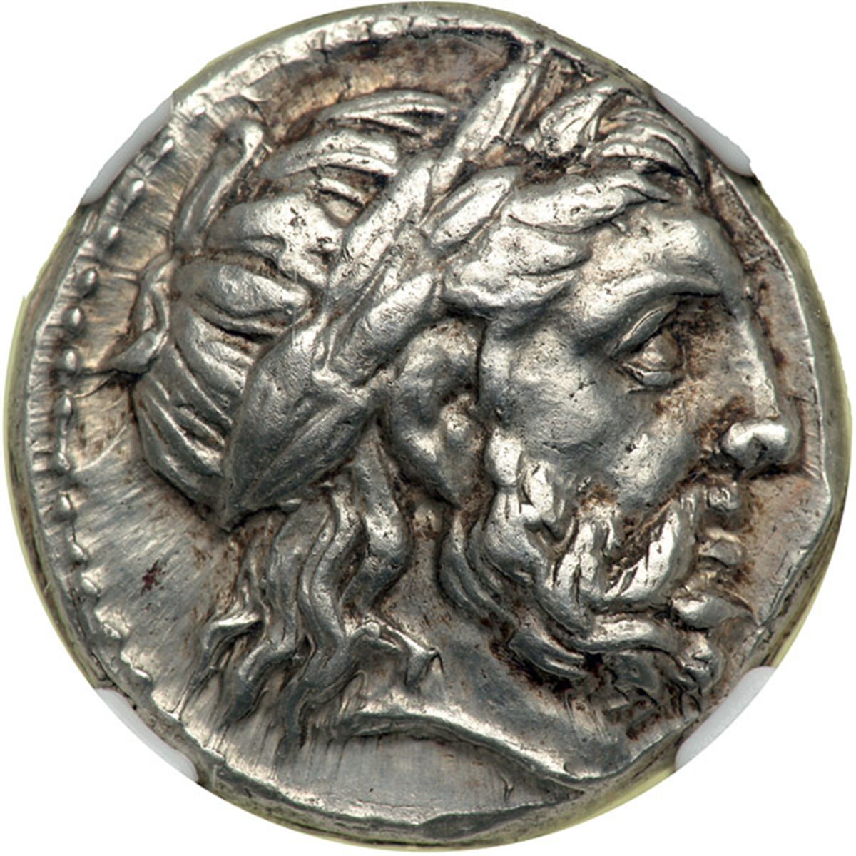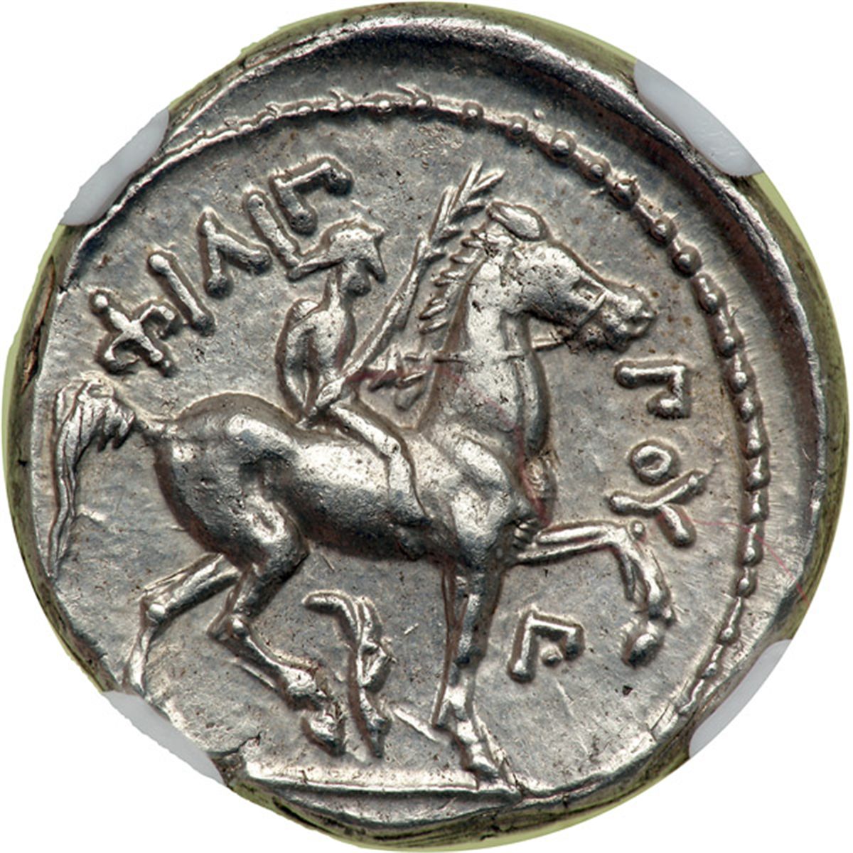 Kingdom of Macedon. Philip II, 359-336 BC. AR Tetradrachm (14.43 g) minted posthumously at Amphipolis, c. 323-315 BC. Laureate head right of Zeus. Reverse: Youth on horseback right, holding palm. Le Rider Amphipolis III, plate 46, 17. NGC graded Ch XF; Strike 5/5; Surface 4/5.