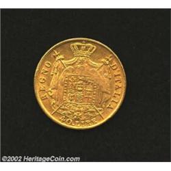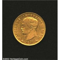 Kingdom of Napoleon. Gold 40 Lire 1813M, KM12, clear overdate with second 1 over 0, VF+ with some luster, minor surface marks. Important notice: We expect to be auctioning lots at the rate of 200-250 per hour. Sometimes eBay Premier live bid software cannot keep up with that pace, so we strongly recommend that you place a realistic proxy bid now as insurance to avoid disappointment. Also please note that all Heritage/CAA lots purchased through eBay Premier carry a 20% Buyer's Premium. Please make sure you read the Terms and Conditions.