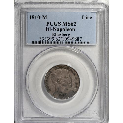 <B>Kingdom of Napoleon. Lira 1810M, </B></I>KM-C8.1, MS62 PCGS Eliasberg, attractive old-time toning and scarce in this grade.<BR><I>From the Louis E. Eliasberg, Sr. Collection</B></I><BR><BR><b>Shipping:</b> Coin/Currency (<a target="_blank" href="http://www.heritageauctions.com/common/shipping.php">view shipping information</a>)