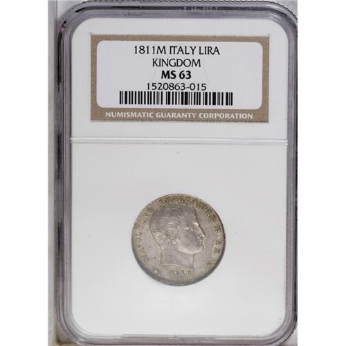 <B>Kingdom of Napoleon. Napoleon I 1 Lira 1811M,</B></I> KM-C8.1, MS63 NGC. Toned in shades of gray with golden highlights and light friction on the highpoints.