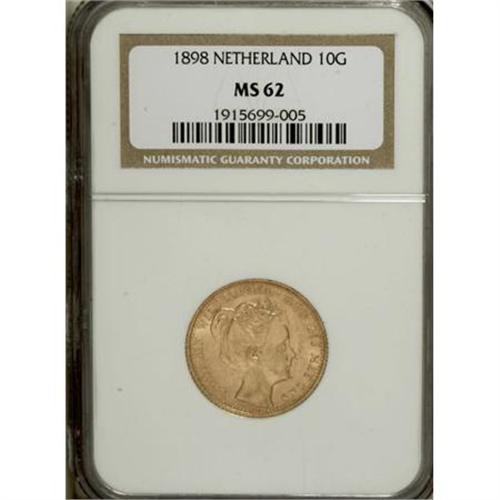 <B>Wilhelmina gold 10 Gulden 1898,</B></I> KM124, MS62 NGC. One-year type.<BR><BR><b>Shipping:</b> Coins & Currency (<a target="_blank" href="http://www.heritageauctions.com/common/shipping.php">view shipping information</a>)