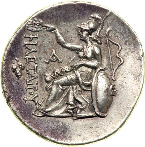 Kingdom of Pergamon. Attalos I, 241-197 BC. AR Tetradrachm (17.00 g). Diademed head right of Philetairos. Reverse: Athena enthroned left, resting left arm on shield; in left field, bunch of grapes and "A." Westermark V.LXXVI/R; cf. BMC 37. Flan has small bend. Very Fine.