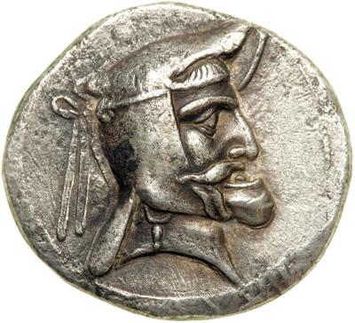 Kingdom of Persis. Autophradates I, c. late 3rd to early 2nd century BC. AR Tetradrachm (16.4 g). Head right of Autophradates I wearing satrapal headdress, earring hanging below. Reverse: Fire-temple surmounted by stepped battlements; Autophradates on the left and standard to the right; half-figure of Ahura-Mazda above; around, Aramaic legend. Cf. BMC p. 200-201, 1-3; Sear GC 6191. Choice Very Fine.