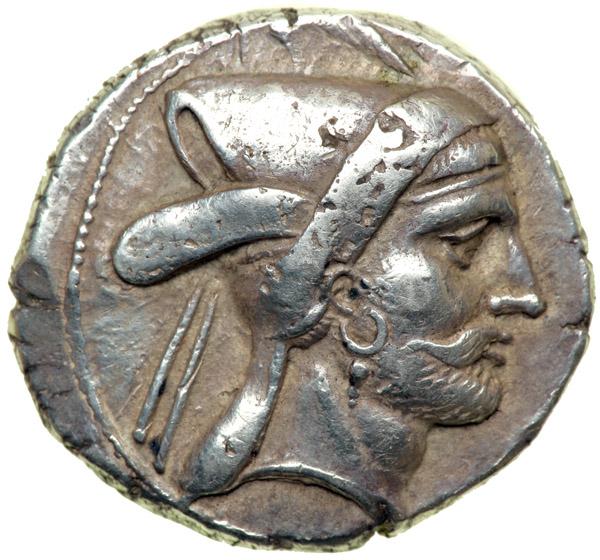 Kingdom of Persis. Bagadat, Third Century BC. AR Tetradrachm (16.41 g). Head right of Bagadat wearing kyrbasia (satrapal cap). Reverse: Bagadat enthroned left holding scepter and cup; to left, standard. Alram 511. Very rare. About Extremely Fine. .