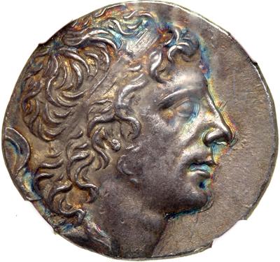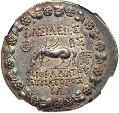 Kingdom of Pontos. Mithradates VI, 120-63 BC. AR Tetradrachm (16.59 g), dated year 202, 11th month (96/5 BC). Diademed head right of Mithradates VI. Reverse: Pegasos left, drinking; year in right field; month at bottom; all within ivy wreath. Waddington (Recueil Général) p. 15, 13; BMC 2. NGC graded MS: Strike 4/5; Surface 5/5. Holder has incorrect year (208). Our grade is Extremely Fine.