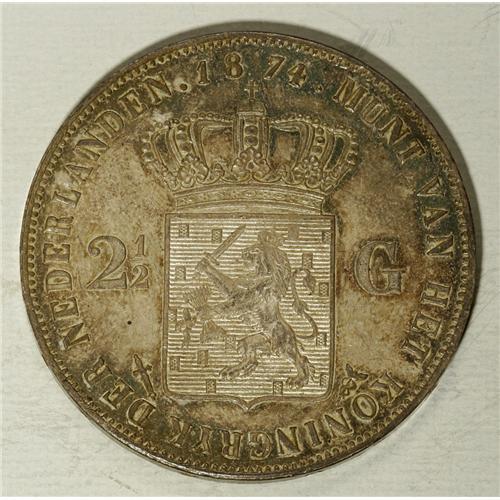 <B>Kingdom of the Netherlands. William III 2-1/2 Gulden 1874,</B></I> KM82, Choice AU with superb original toning over essentially full luster.<BR><I>From the Louis E. Eliasberg, Sr. Collection</B></I><BR><BR><b>Shipping:</b> Coin/Currency (<a target="_blank" href="http://www.heritageauctions.com/common/shipping.php">view shipping information</a>)