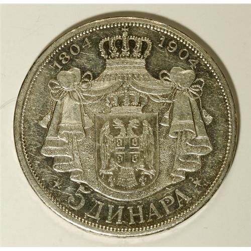 <B>Kingdom silver 5-Dinara 1904,</B></I> KM-27, lustrous AU with multiple marks.<BR><BR><b>Shipping:</b> Coin/Currency (<a target="_blank" href="http://www.heritageauctions.com/common/shipping.php">view shipping information</a>)