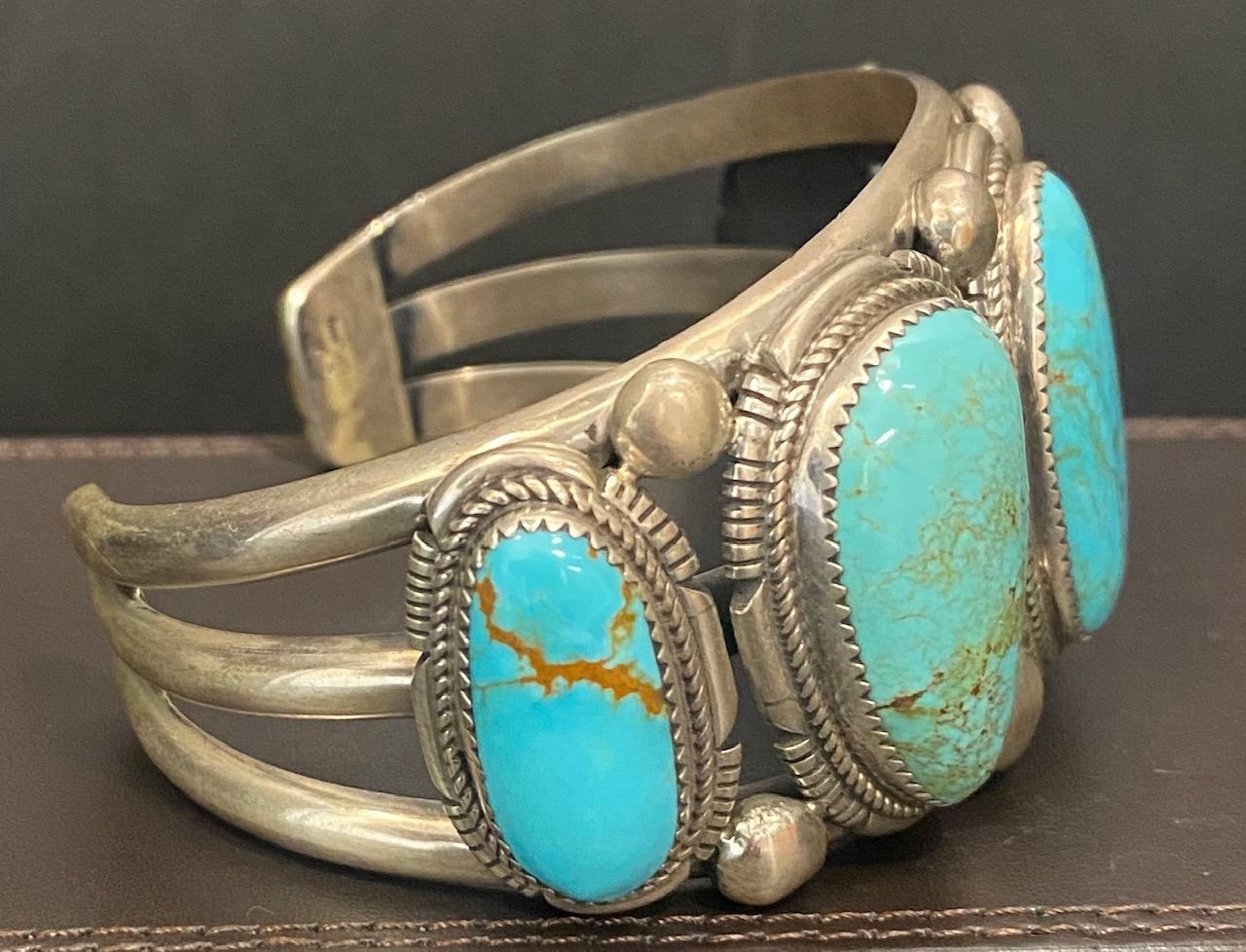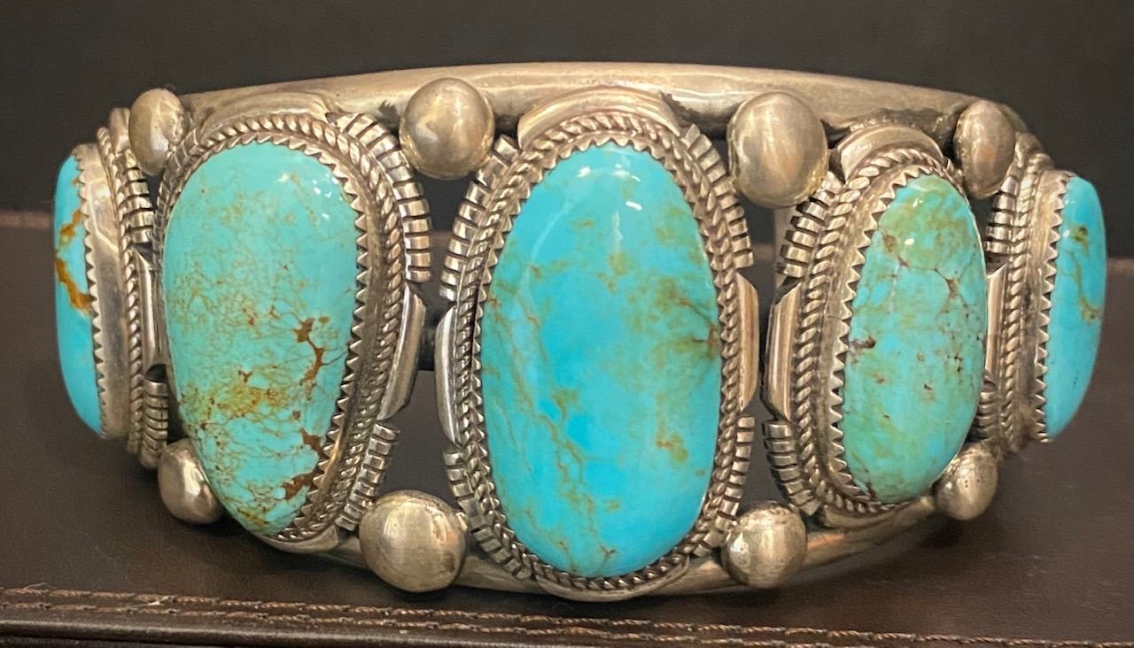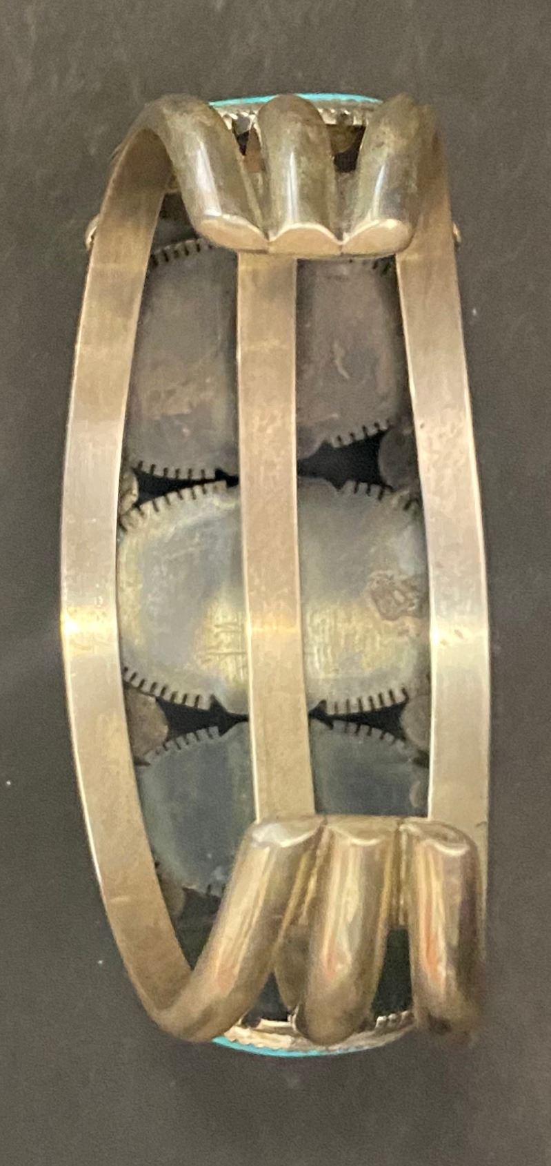 Kingman 5 stone heavy cuff C Hallmark unknown artist. 1 3/4"H X 6 1/4"inside X 1 5/8" opening 107 grams Really nice and heavy weight