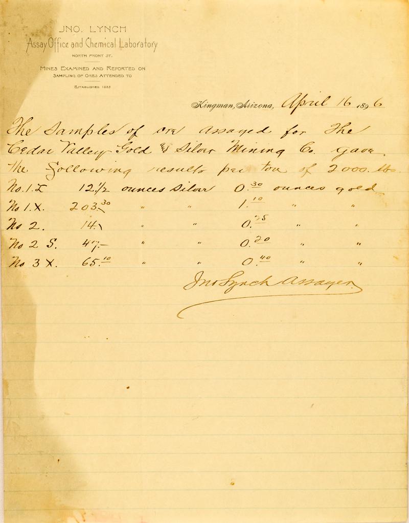 Kingman,AZ - Mohave County - April 19, 1896 - Lynch Assay Office :