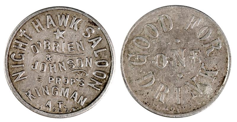 Obverse: Night Hawk Saloon / O'Brien / & / Johnson / Props / Kingman / A.T.; reverse: Good For / One / Drink. WM, 21mm, R8, very fine condition.