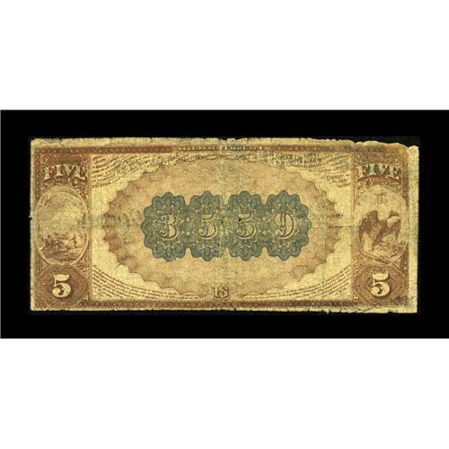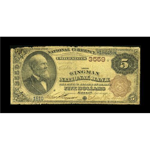 <B>Kingman, KS</B></I> - $5 1882 Brown Back Fr. 469 <B>The Kingman NB</B></I> Ch. # 3559<BR>A newly discovered note from this excessively rare bank which issued Brown Backs only. The Kelly census shows only one note extant from here (which has never been offered at public sale), no surprise as this bank was in existence for a mere four years and had but $370 outstanding in 1915. Well circulated but intact <B>Good-Very Good,</B></I> easily likely to see bidding reach or exceed...<BR><BR><b>Shipping:</b> Coin/Currency (<a target="_blank" href="http://www.heritageauctions.com/common/shipping.php">view shipping information</a>)
