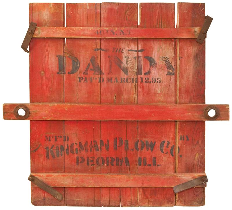Kingman Plow Co.-Peoria, IL primitive "Dandy" door/gate, wood w/orig red paint & stenciling, patd March 12, 1895, VG orig cond, 40"H x 43"W.