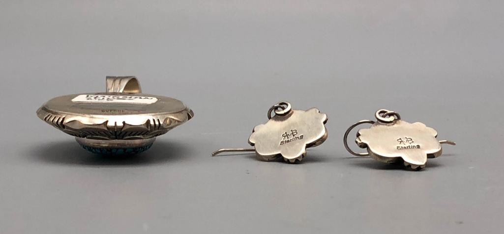 Up for consideration is a turquoise pendant and earring set. This set has gorgeous Kingman Spiderweb turquoise cabochons. The pendant has raised like overlay style with a nice bail that can fit over most chains. The earrings have hand stamped designs. Both pieces are stamped as sterling. MAKER: Pendant hallmarked Eugene Belone (Navajo). Earrings are RUB. APPROX AGE: Modern. SIZE: Pendant measures 2-3/4 inches long X 1-1/2 inches wide. Earrings measures 1 inches long X 3/4 inches wide. Combined weight is 47.3 grams. CONDITION: Good for its age, normal wear expected. Please look closely at the pictures as they are an important part of our description and are hereby incorporated into the description, specifically with regards to condition. SHIPPING: There will be a $5 handling / packaging fee for shipping this lot. The actual cost of postage will be added on top of that. BUY IT NOW: If you would like to buy this item now, without waiting for the auction day to bid on it, we do offer this option (which is available up to 48 hours before the actual auction starts). The “Buy it Now” price is the high estimate of this lot (plus applicable fees and the Buyer's premium is discounted to 10% when using the Buy it Now option). If you would like to exercise this option, you must contact us by email (or phone as long as you talk to someone live). Reference this lot number and your intention to "Buy it Now."