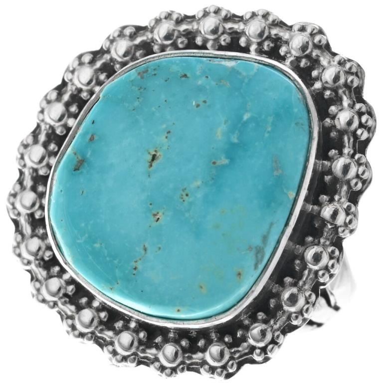 This Turquoise Silver Navajo Ring takes inspiration from old pawn jewelry. The Sterling setting holds a really, nice looking, top quality, Kingman stone that is wrapped in a berry, flower pattern. 3/4" wide. Native American made, stamped Sterling and hallmarked.