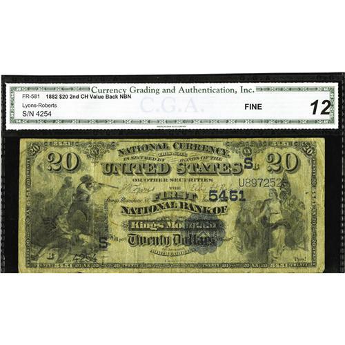 <B>Kings Mountain, NC</B></I> - $20 1882 Value Back Fr. 581 <B>The First NB </B></I> Ch. # (S)5451<BR>Some pinholes are seen through the CGA <B>Fine 12</B></I> holder. An exceptionally rare denomination and type from North Carolina, and from a none too common bank as well. This becomes only the fifth example known on the entire state and is tied for finest known. Though lightly soiled, still a major North Carolina rarity likely to see bidding reach or exceed...