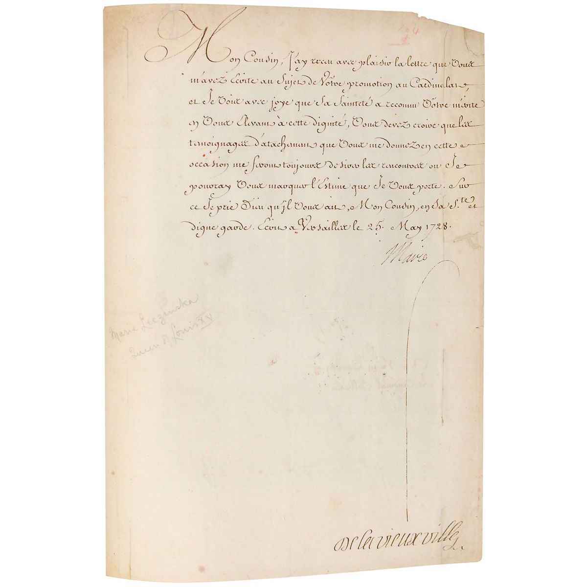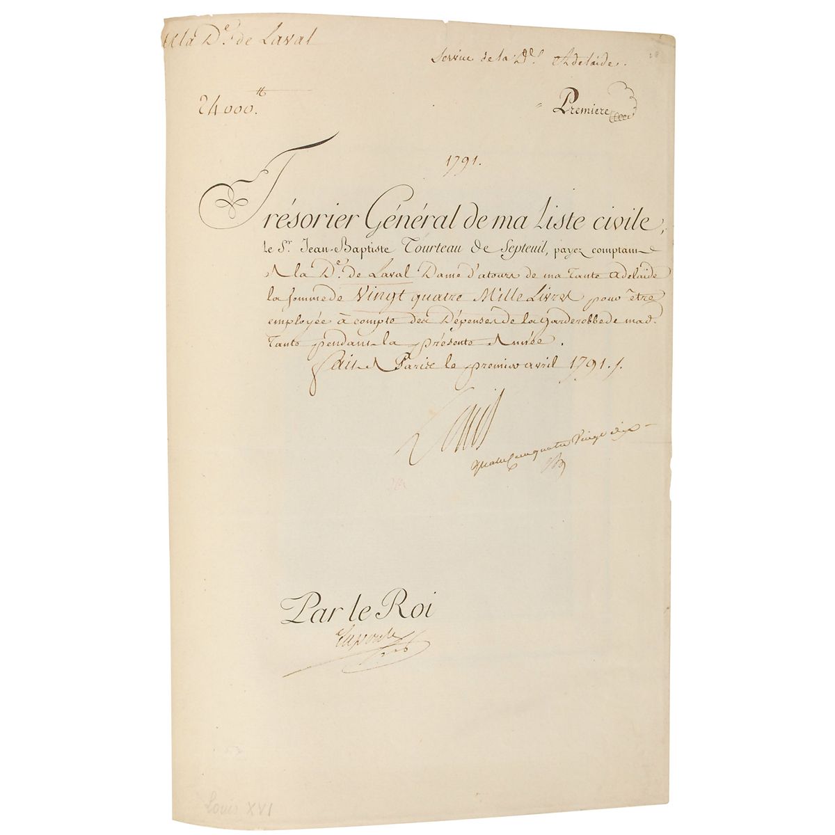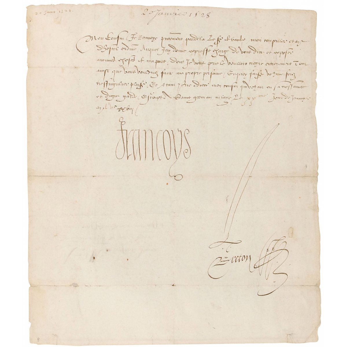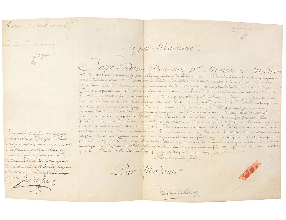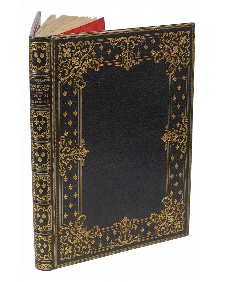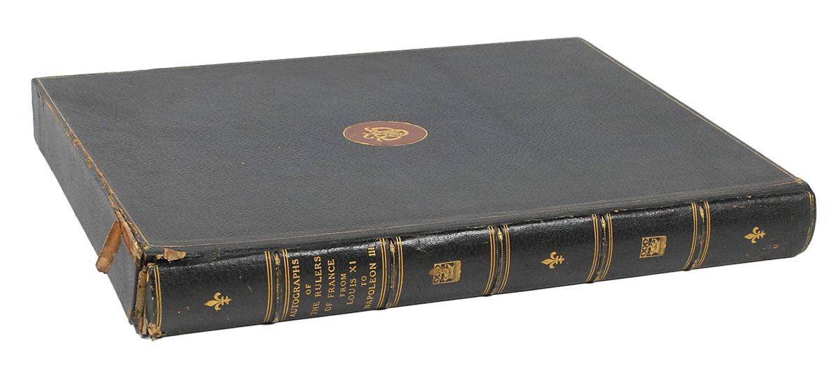 A one-of-a-kind set of 32 letters and documents, ranging in date from 1483 to 1873, signed by every French king and emperor from the time of King Louis XI to Napoleon III; the queens and empresses are also all present, beginning with Marie de Medici. Each piece has been professionally inlaid into a stunning leather-bound presentation book, each preceded by an inlaid engraved portrait of the ruler. Highlights of the collection include Catherine de’ Medici, Marie Antoinette, Napoleon Bonaparte, and the exceptionally rare Francis II. While most of the included pieces are documents and letters, there are several rare ALSs, most notably of Empress Josephine and Charles X. The book is arranged chronologically, and signers are (as they appear): Louis XI, DS on vellum dated 1483; Charles VIII, DS on vellum dated 1488; Louis XII, DS on vellum dated 1503; Francis I, LS to a European monarch dated 1528; Henry II, LS to the Duke d’Angouleme dated 1558; Catherine de' Medici, LS to her ambassador to Spain dated 1566; Francis II, DS on vellum dated 1560; Charles IX, DS on vellum dated 1562, signed by Charles at the age of twelve; Henry III, DS on vellum dated 1585; Henry IV, LS dated just 40 days before his assassination in 1610; Marie de’ Medici, DS on vellum dated 1621; Louis XIII, an important DS enumerating an inventory of royal tapestries, dated 1621; Anne of Austria, LS with an autograph subscription dated 1644; Louis XIV, DS with the addition of “Bon,” dated 1713; Maria Theresa of Spain, DS on vellum; Philippe II Duke of Orleans, LS with an eight-line autograph subscription; Françoise Marie de Bourbon, DS on vellum dated 1724; Louis XV, LS to a European monarch, dated 1727; Marie Leszczynska, LS to a cardinal dated 1728; Louis XVI, DS dated 1791; Marie Antoinette, DS with the addition of “payez,” dated 1785; Napoleon Bonaparte, letter from the Duke of Feltre endorsed by Napoleon, dated 1811; Josephine de Beauharnais, ALS signed “Lapagerie Bonaparte” circa 1800; Marie Louise of Austria, DS as Empress of France, dated 1812; Louis XVIII, DS dated 1818; Marie Josephine of Savoy, DS on vellum dated 1781; Charles X, undated ALS written as king, 1824-1830; Maria Theresa of Savoy, DS on vellum dated 1781; Louis-Philippe I, ALS in English dated 1804; Maria Amalia of Naples and Sicily, ALS dated 1822; Napoleon III, LS dated 1861; and Eugenie de Montijo, ALS dated 1873. The book measures a substantial 14 x 19 and is housed in a matching custom-made clamshell case. In overall very good to fine condition.