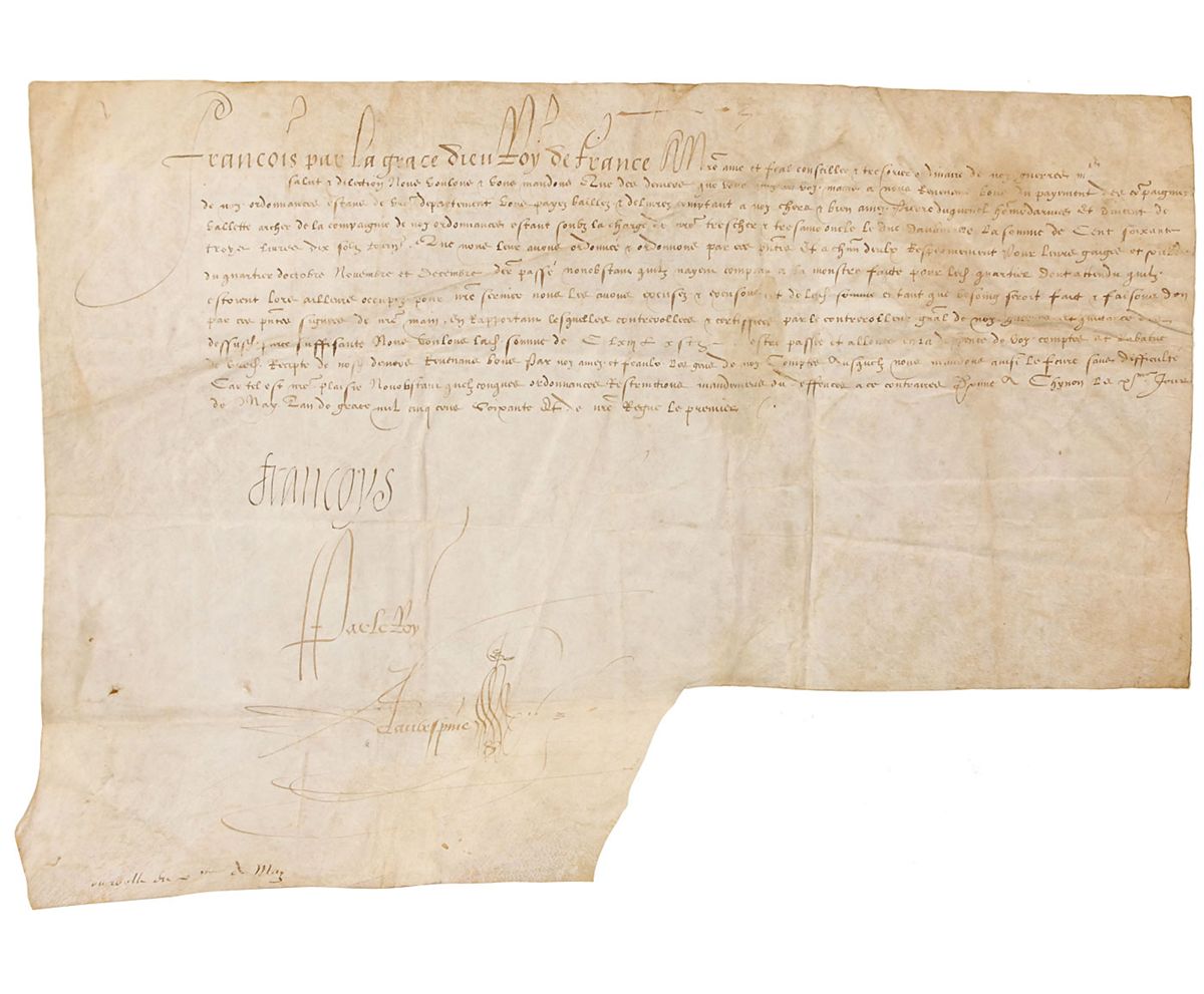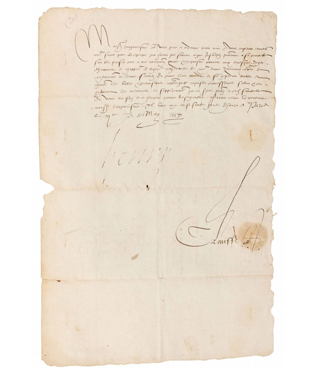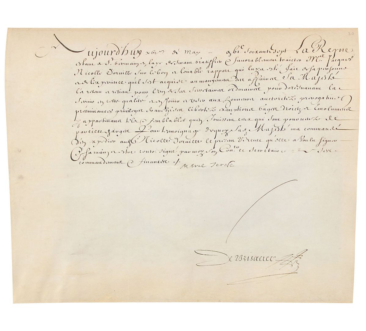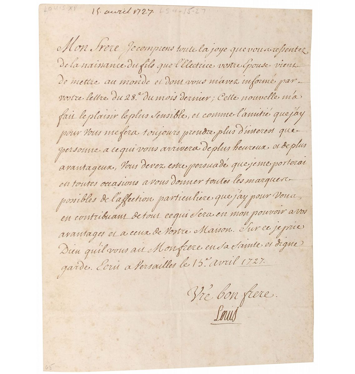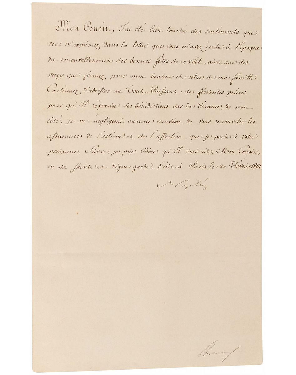 A one-of-a-kind set of 32 letters and documents, ranging in date from 1483 to 1873, signed by every French king and emperor from the time of King Louis XI to Napoleon III; the queens and empresses are also all present, beginning with Marie de Medici. Each piece has been professionally inlaid into a stunning leather-bound presentation book, each preceded by an inlaid engraved portrait of the ruler. Highlights of the collection include Catherine de’ Medici, Marie Antoinette, Napoleon Bonaparte, and the exceptionally rare Francis II. While most of the included pieces are documents and letters, there are several rare ALSs, most notably of Empress Josephine and Charles X. The book is arranged chronologically, and signers are (as they appear): Louis XI, DS on vellum dated 1483; Charles VIII, DS on vellum dated 1488; Louis XII, DS on vellum dated 1503; Francis I, LS to a European monarch dated 1528; Henry II, LS to the Duke d’Angouleme dated 1558; Catherine de' Medici, LS to her ambassador to Spain dated 1566; Francis II, DS on vellum dated 1560; Charles IX, DS on vellum dated 1562, signed by Charles at the age of twelve; Henry III, DS on vellum dated 1585; Henry IV, LS dated just 40 days before his assassination in 1610; Marie de’ Medici, DS on vellum dated 1621; Louis XIII, an important DS enumerating an inventory of royal tapestries, dated 1621; Anne of Austria, LS with an autograph subscription dated 1644; Louis XIV, DS with the addition of “Bon,” dated 1713; Maria Theresa of Spain, DS on vellum; Philippe II Duke of Orleans, LS with an eight-line autograph subscription; Françoise Marie de Bourbon, DS on vellum dated 1724; Louis XV, LS to a European monarch, dated 1727; Marie Leszczynska, LS to a cardinal dated 1728; Louis XVI, DS dated 1791; Marie Antoinette, DS with the addition of “payez,” dated 1785; Napoleon Bonaparte, letter from the Duke of Feltre endorsed by Napoleon, dated 1811; Josephine de Beauharnais, ALS signed “Lapagerie Bonaparte” circa 1800; Marie Louise of Austria, DS as Empress of France, dated 1812; Louis XVIII, DS dated 1818; Marie Josephine of Savoy, DS on vellum dated 1781; Charles X, undated ALS written as king, 1824-1830; Maria Theresa of Savoy, DS on vellum dated 1781; Louis-Philippe I, ALS in English dated 1804; Maria Amalia of Naples and Sicily, ALS dated 1822; Napoleon III, LS dated 1861; and Eugenie de Montijo, ALS dated 1873. The book measures a substantial 14 x 19 and is housed in a matching custom-made clamshell case. In overall very good to fine condition.