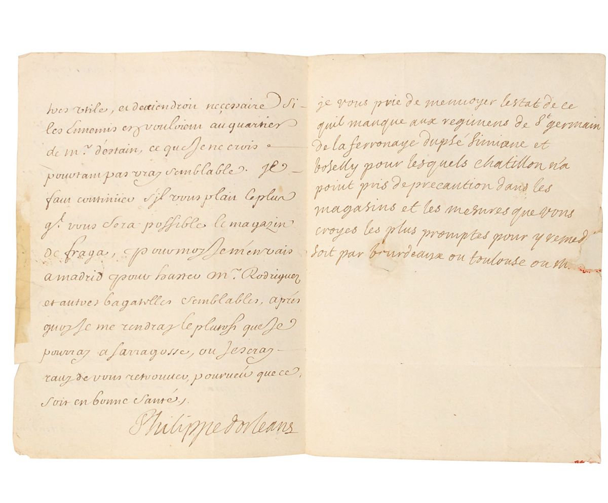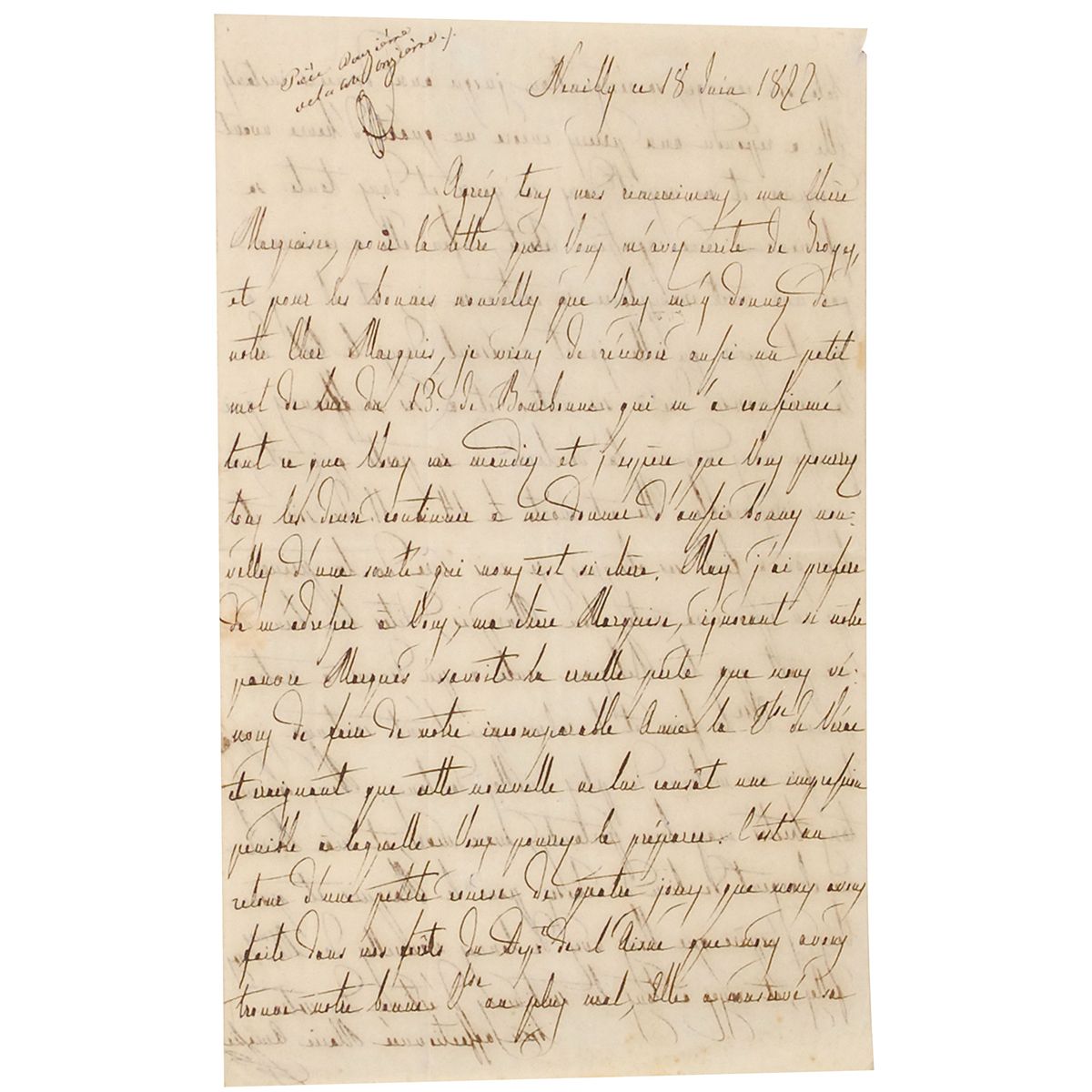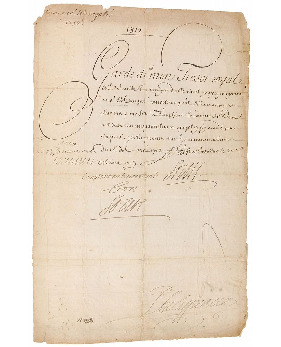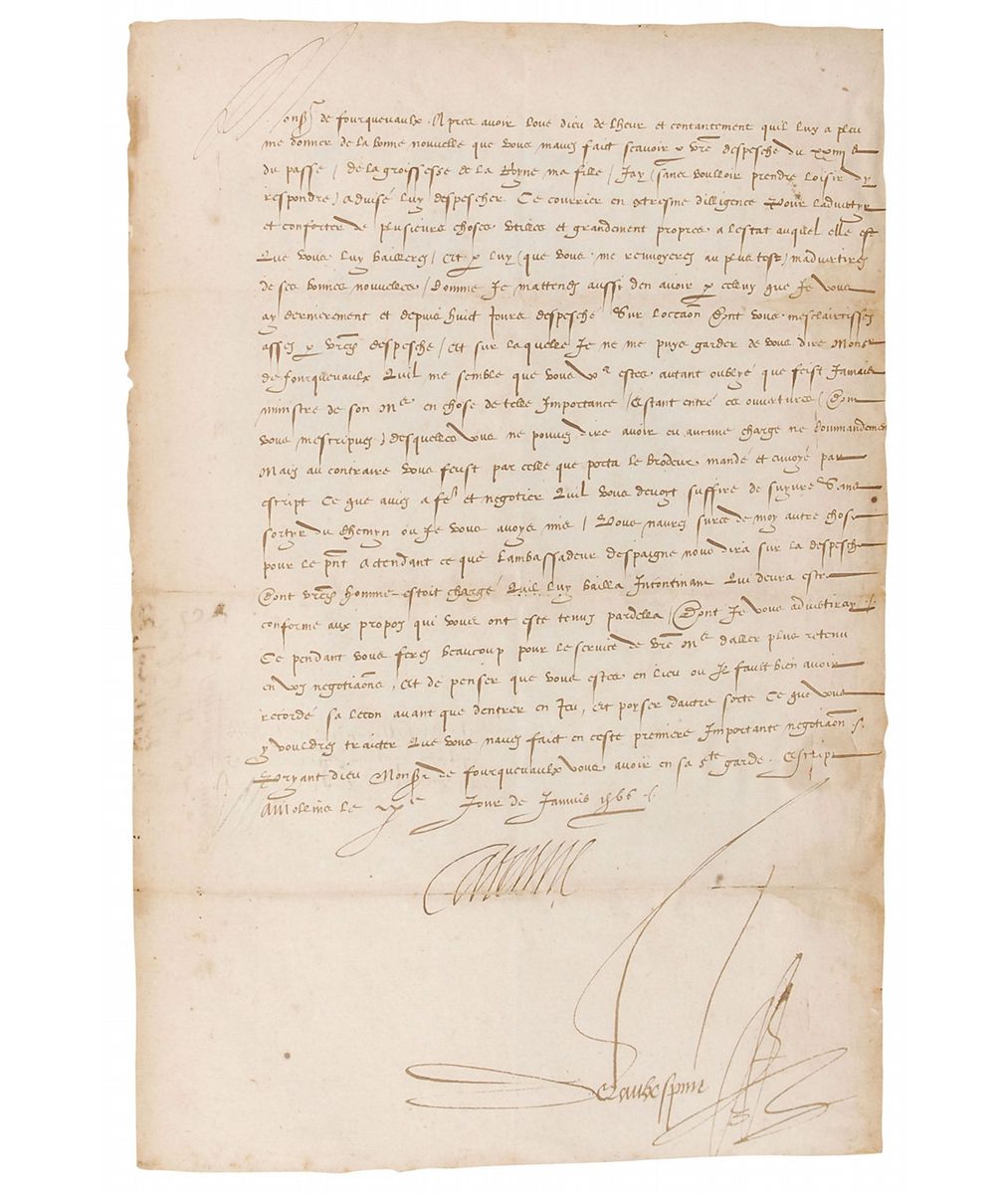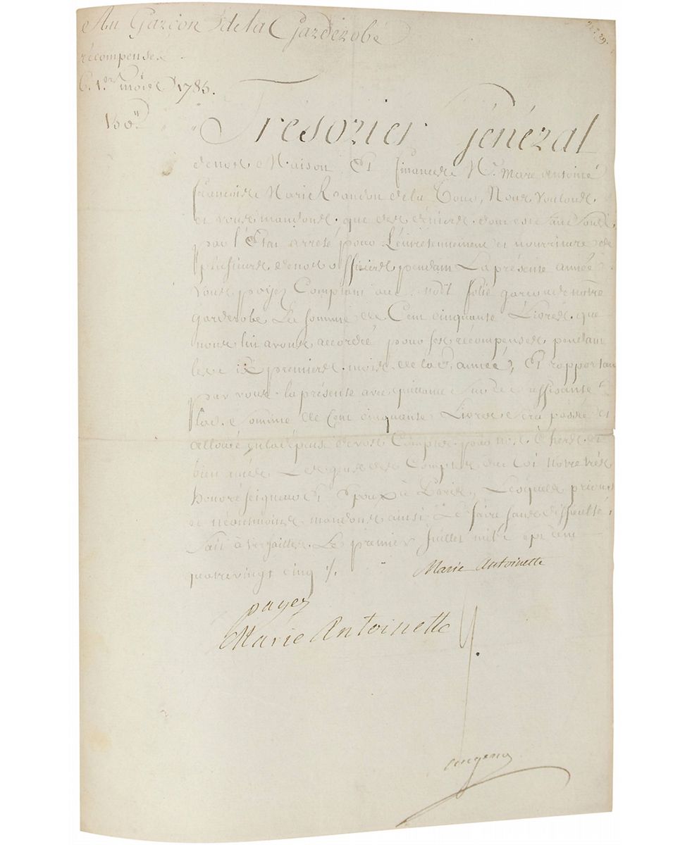 A one-of-a-kind set of 32 letters and documents, ranging in date from 1483 to 1873, signed by every French king and emperor from the time of King Louis XI to Napoleon III; the queens and empresses are also all present, beginning with Marie de Medici. Each piece has been professionally inlaid into a stunning leather-bound presentation book, each preceded by an inlaid engraved portrait of the ruler. Highlights of the collection include Catherine de’ Medici, Marie Antoinette, Napoleon Bonaparte, and the exceptionally rare Francis II. While most of the included pieces are documents and letters, there are several rare ALSs, most notably of Empress Josephine and Charles X. The book is arranged chronologically, and signers are (as they appear): Louis XI, DS on vellum dated 1483; Charles VIII, DS on vellum dated 1488; Louis XII, DS on vellum dated 1503; Francis I, LS to a European monarch dated 1528; Henry II, LS to the Duke d’Angouleme dated 1558; Catherine de' Medici, LS to her ambassador to Spain dated 1566; Francis II, DS on vellum dated 1560; Charles IX, DS on vellum dated 1562, signed by Charles at the age of twelve; Henry III, DS on vellum dated 1585; Henry IV, LS dated just 40 days before his assassination in 1610; Marie de’ Medici, DS on vellum dated 1621; Louis XIII, an important DS enumerating an inventory of royal tapestries, dated 1621; Anne of Austria, LS with an autograph subscription dated 1644; Louis XIV, DS with the addition of “Bon,” dated 1713; Maria Theresa of Spain, DS on vellum; Philippe II Duke of Orleans, LS with an eight-line autograph subscription; Françoise Marie de Bourbon, DS on vellum dated 1724; Louis XV, LS to a European monarch, dated 1727; Marie Leszczynska, LS to a cardinal dated 1728; Louis XVI, DS dated 1791; Marie Antoinette, DS with the addition of “payez,” dated 1785; Napoleon Bonaparte, letter from the Duke of Feltre endorsed by Napoleon, dated 1811; Josephine de Beauharnais, ALS signed “Lapagerie Bonaparte” circa 1800; Marie Louise of Austria, DS as Empress of France, dated 1812; Louis XVIII, DS dated 1818; Marie Josephine of Savoy, DS on vellum dated 1781; Charles X, undated ALS written as king, 1824-1830; Maria Theresa of Savoy, DS on vellum dated 1781; Louis-Philippe I, ALS in English dated 1804; Maria Amalia of Naples and Sicily, ALS dated 1822; Napoleon III, LS dated 1861; and Eugenie de Montijo, ALS dated 1873. The book measures a substantial 14 x 19 and is housed in a matching custom-made clamshell case. In overall very good to fine condition.
