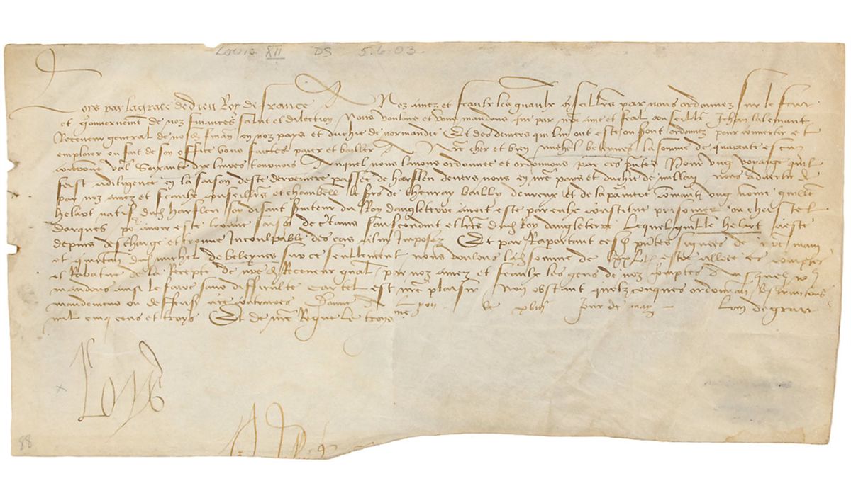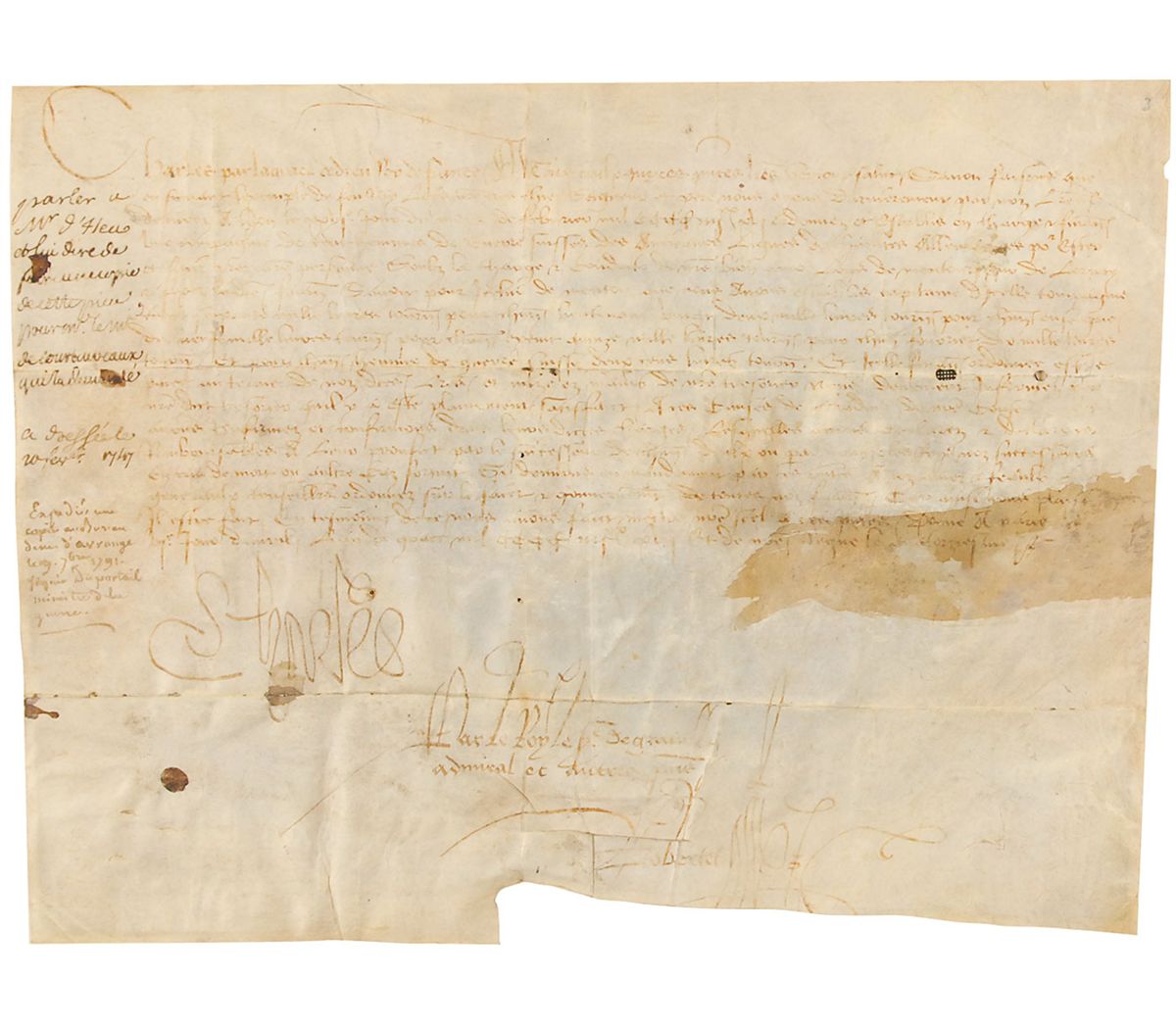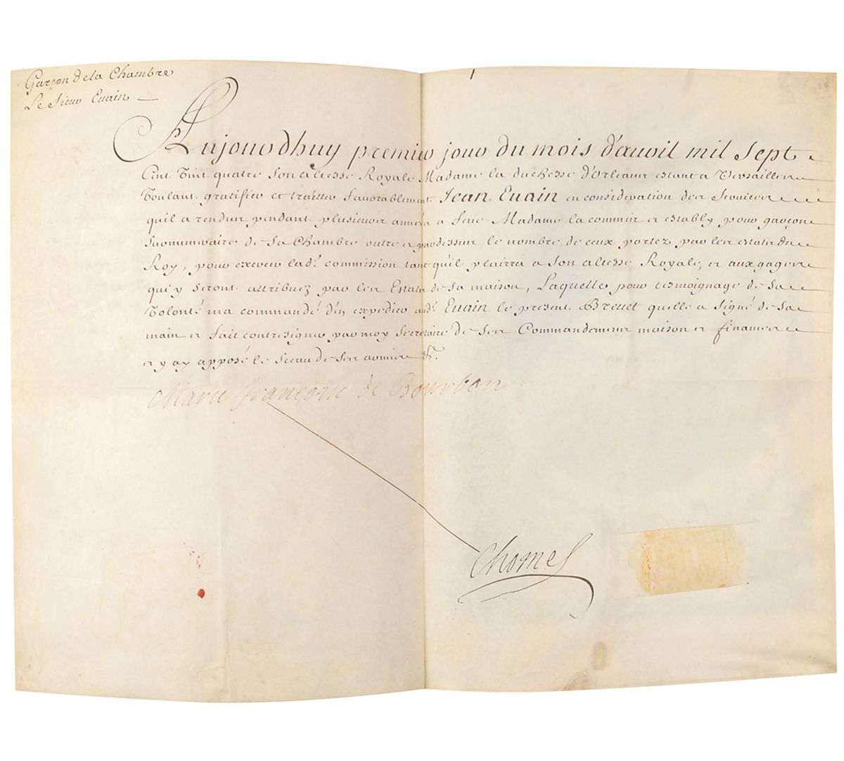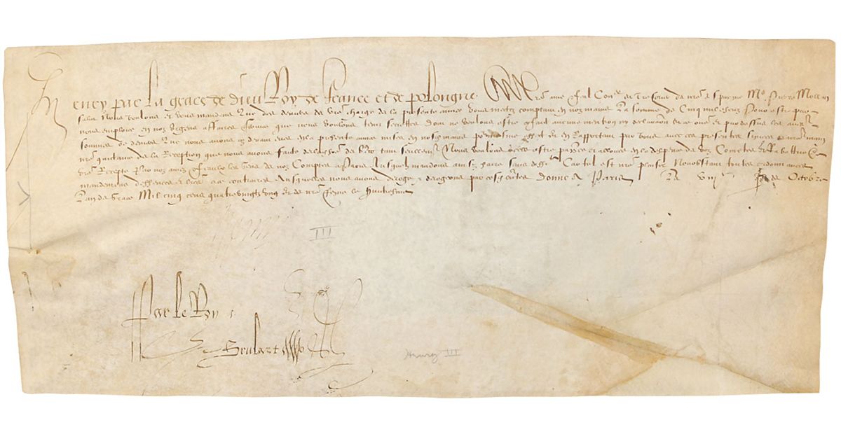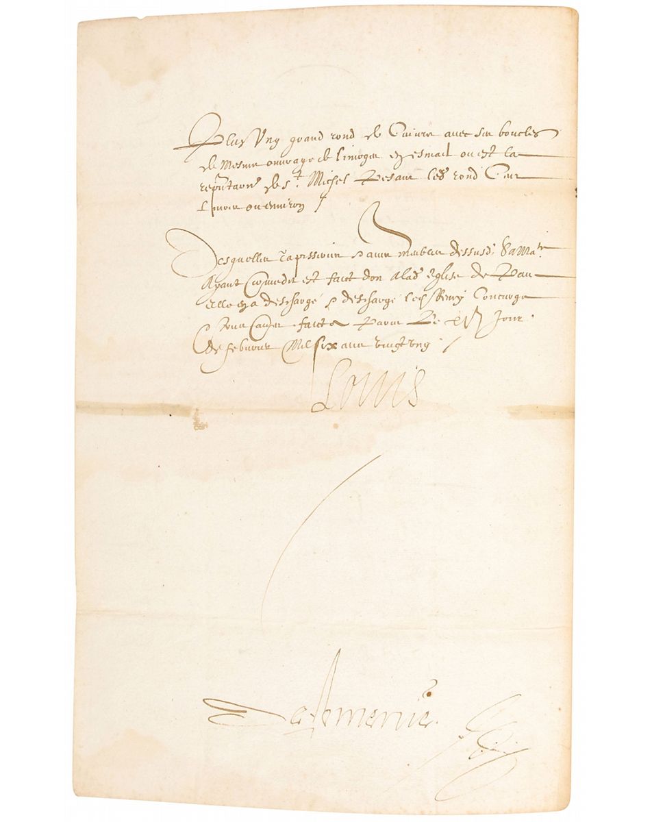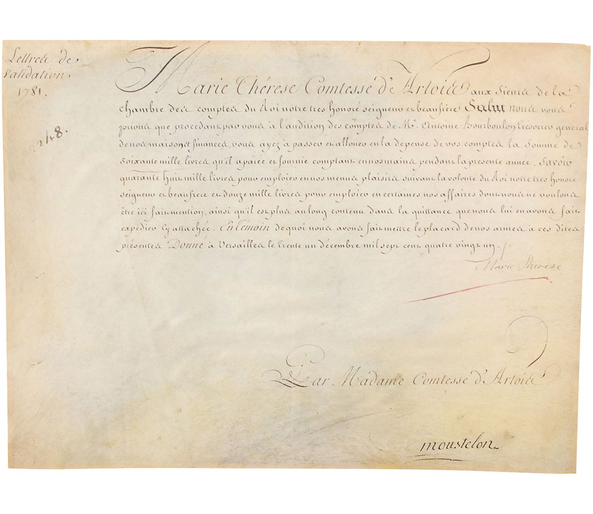 A one-of-a-kind set of 32 letters and documents, ranging in date from 1483 to 1873, signed by every French king and emperor from the time of King Louis XI to Napoleon III; the queens and empresses are also all present, beginning with Marie de Medici. Each piece has been professionally inlaid into a stunning leather-bound presentation book, each preceded by an inlaid engraved portrait of the ruler. Highlights of the collection include Catherine de’ Medici, Marie Antoinette, Napoleon Bonaparte, and the exceptionally rare Francis II. While most of the included pieces are documents and letters, there are several rare ALSs, most notably of Empress Josephine and Charles X. The book is arranged chronologically, and signers are (as they appear): Louis XI, DS on vellum dated 1483; Charles VIII, DS on vellum dated 1488; Louis XII, DS on vellum dated 1503; Francis I, LS to a European monarch dated 1528; Henry II, LS to the Duke d’Angouleme dated 1558; Catherine de' Medici, LS to her ambassador to Spain dated 1566; Francis II, DS on vellum dated 1560; Charles IX, DS on vellum dated 1562, signed by Charles at the age of twelve; Henry III, DS on vellum dated 1585; Henry IV, LS dated just 40 days before his assassination in 1610; Marie de’ Medici, DS on vellum dated 1621; Louis XIII, an important DS enumerating an inventory of royal tapestries, dated 1621; Anne of Austria, LS with an autograph subscription dated 1644; Louis XIV, DS with the addition of “Bon,” dated 1713; Maria Theresa of Spain, DS on vellum; Philippe II Duke of Orleans, LS with an eight-line autograph subscription; Françoise Marie de Bourbon, DS on vellum dated 1724; Louis XV, LS to a European monarch, dated 1727; Marie Leszczynska, LS to a cardinal dated 1728; Louis XVI, DS dated 1791; Marie Antoinette, DS with the addition of “payez,” dated 1785; Napoleon Bonaparte, letter from the Duke of Feltre endorsed by Napoleon, dated 1811; Josephine de Beauharnais, ALS signed “Lapagerie Bonaparte” circa 1800; Marie Louise of Austria, DS as Empress of France, dated 1812; Louis XVIII, DS dated 1818; Marie Josephine of Savoy, DS on vellum dated 1781; Charles X, undated ALS written as king, 1824-1830; Maria Theresa of Savoy, DS on vellum dated 1781; Louis-Philippe I, ALS in English dated 1804; Maria Amalia of Naples and Sicily, ALS dated 1822; Napoleon III, LS dated 1861; and Eugenie de Montijo, ALS dated 1873. The book measures a substantial 14 x 19 and is housed in a matching custom-made clamshell case. In overall very good to fine condition.