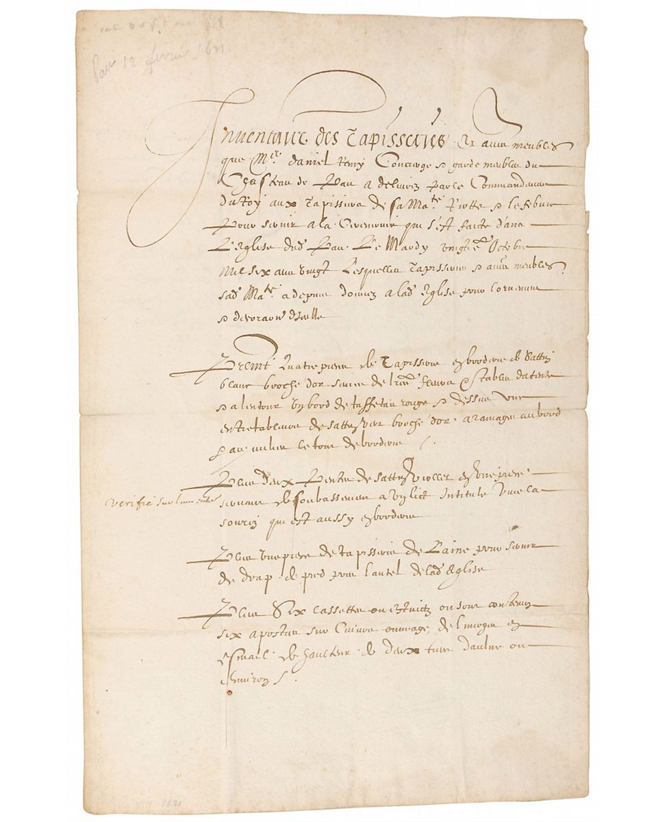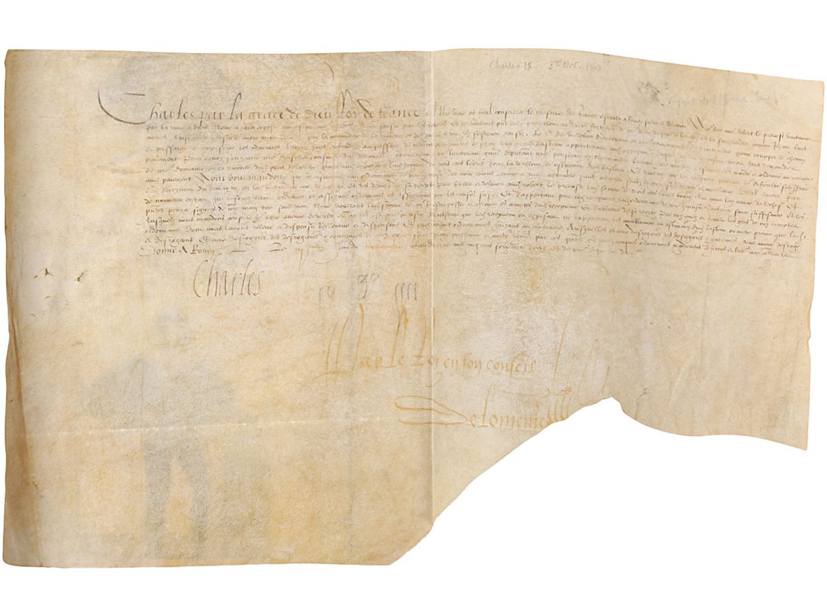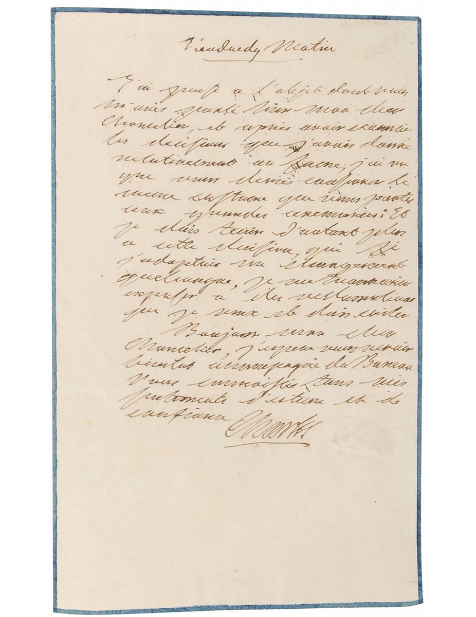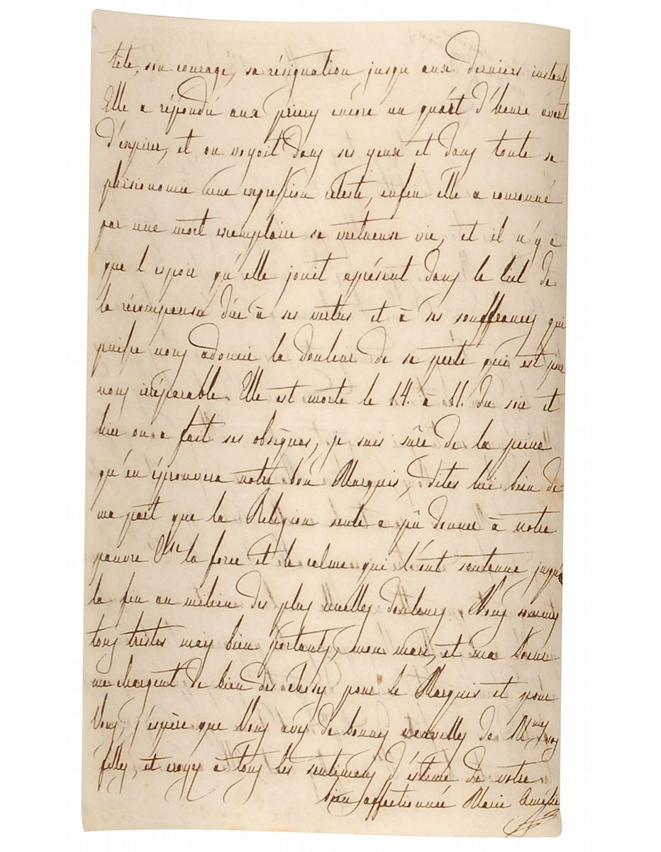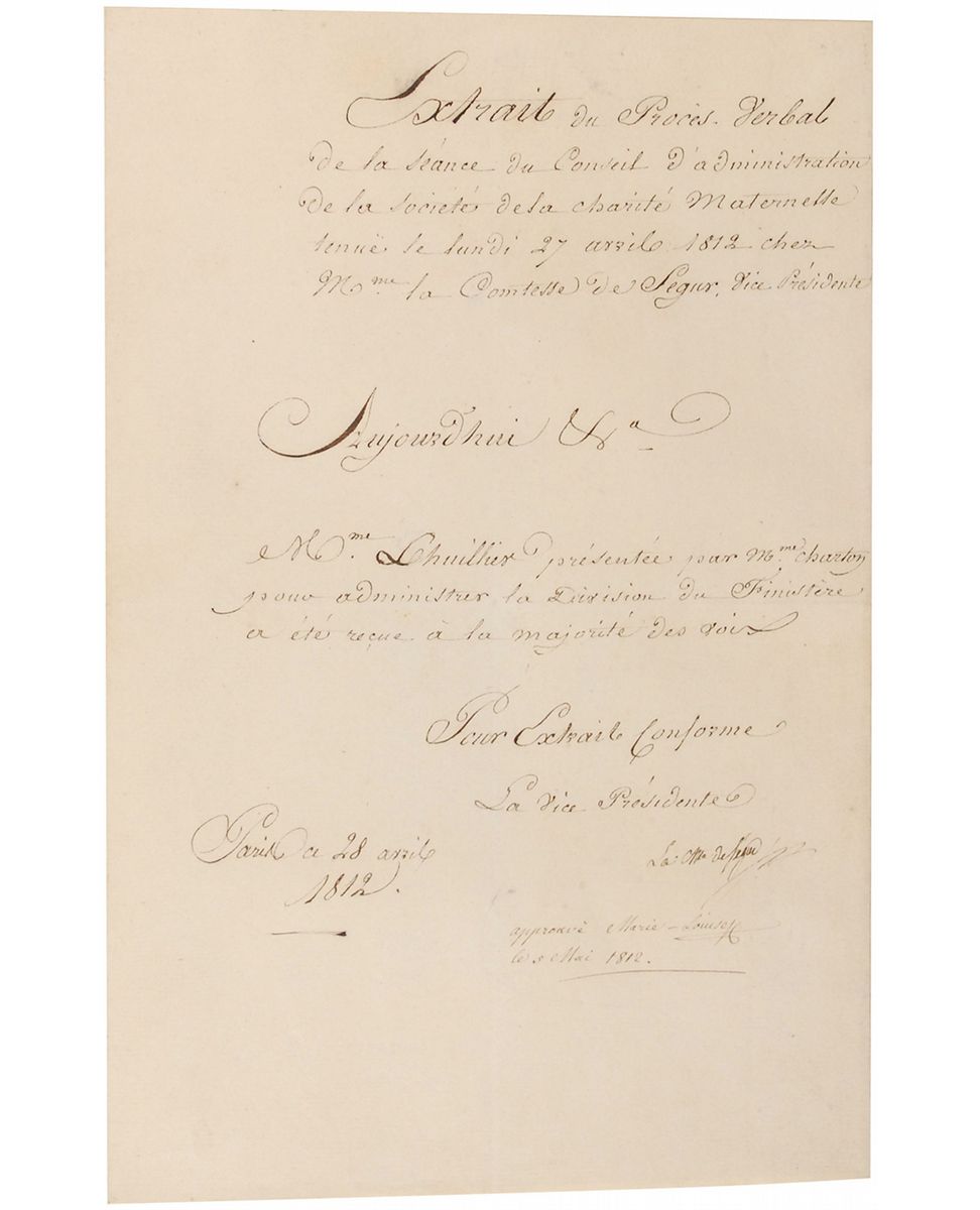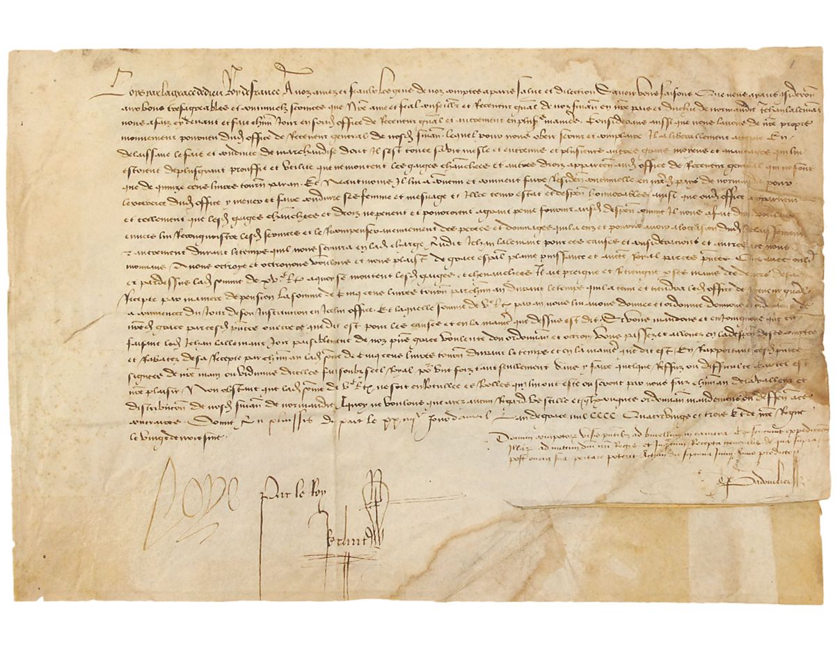 A one-of-a-kind set of 32 letters and documents, ranging in date from 1483 to 1873, signed by every French king and emperor from the time of King Louis XI to Napoleon III; the queens and empresses are also all present, beginning with Marie de Medici. Each piece has been professionally inlaid into a stunning leather-bound presentation book, each preceded by an inlaid engraved portrait of the ruler. Highlights of the collection include Catherine de’ Medici, Marie Antoinette, Napoleon Bonaparte, and the exceptionally rare Francis II. While most of the included pieces are documents and letters, there are several rare ALSs, most notably of Empress Josephine and Charles X. The book is arranged chronologically, and signers are (as they appear): Louis XI, DS on vellum dated 1483; Charles VIII, DS on vellum dated 1488; Louis XII, DS on vellum dated 1503; Francis I, LS to a European monarch dated 1528; Henry II, LS to the Duke d’Angouleme dated 1558; Catherine de' Medici, LS to her ambassador to Spain dated 1566; Francis II, DS on vellum dated 1560; Charles IX, DS on vellum dated 1562, signed by Charles at the age of twelve; Henry III, DS on vellum dated 1585; Henry IV, LS dated just 40 days before his assassination in 1610; Marie de’ Medici, DS on vellum dated 1621; Louis XIII, an important DS enumerating an inventory of royal tapestries, dated 1621; Anne of Austria, LS with an autograph subscription dated 1644; Louis XIV, DS with the addition of “Bon,” dated 1713; Maria Theresa of Spain, DS on vellum; Philippe II Duke of Orleans, LS with an eight-line autograph subscription; Françoise Marie de Bourbon, DS on vellum dated 1724; Louis XV, LS to a European monarch, dated 1727; Marie Leszczynska, LS to a cardinal dated 1728; Louis XVI, DS dated 1791; Marie Antoinette, DS with the addition of “payez,” dated 1785; Napoleon Bonaparte, letter from the Duke of Feltre endorsed by Napoleon, dated 1811; Josephine de Beauharnais, ALS signed “Lapagerie Bonaparte” circa 1800; Marie Louise of Austria, DS as Empress of France, dated 1812; Louis XVIII, DS dated 1818; Marie Josephine of Savoy, DS on vellum dated 1781; Charles X, undated ALS written as king, 1824-1830; Maria Theresa of Savoy, DS on vellum dated 1781; Louis-Philippe I, ALS in English dated 1804; Maria Amalia of Naples and Sicily, ALS dated 1822; Napoleon III, LS dated 1861; and Eugenie de Montijo, ALS dated 1873. The book measures a substantial 14 x 19 and is housed in a matching custom-made clamshell case. In overall very good to fine condition.
