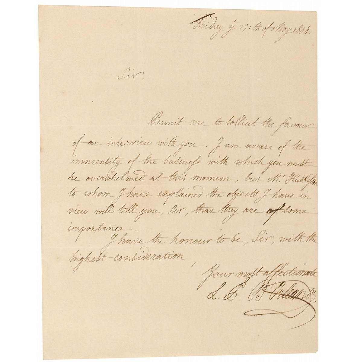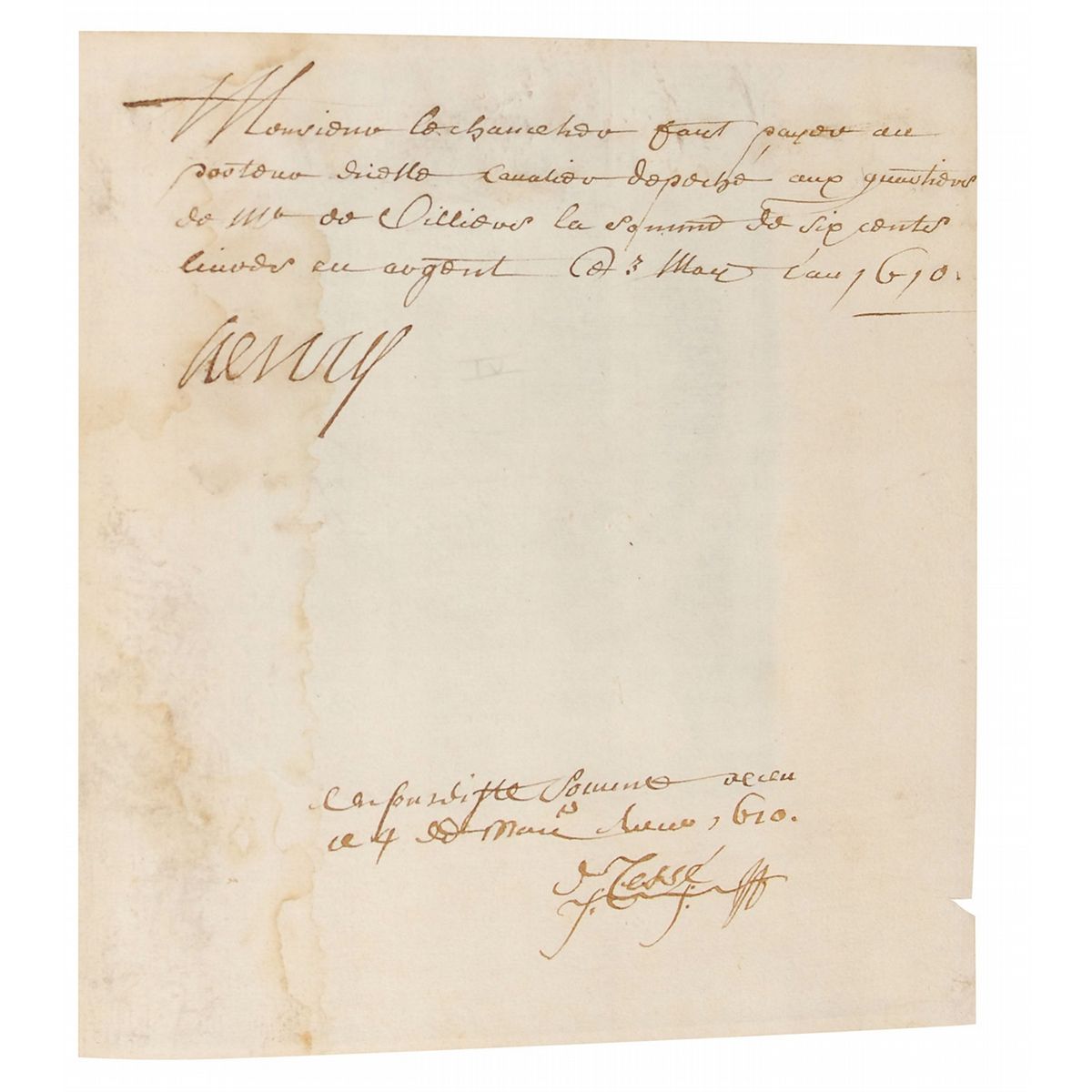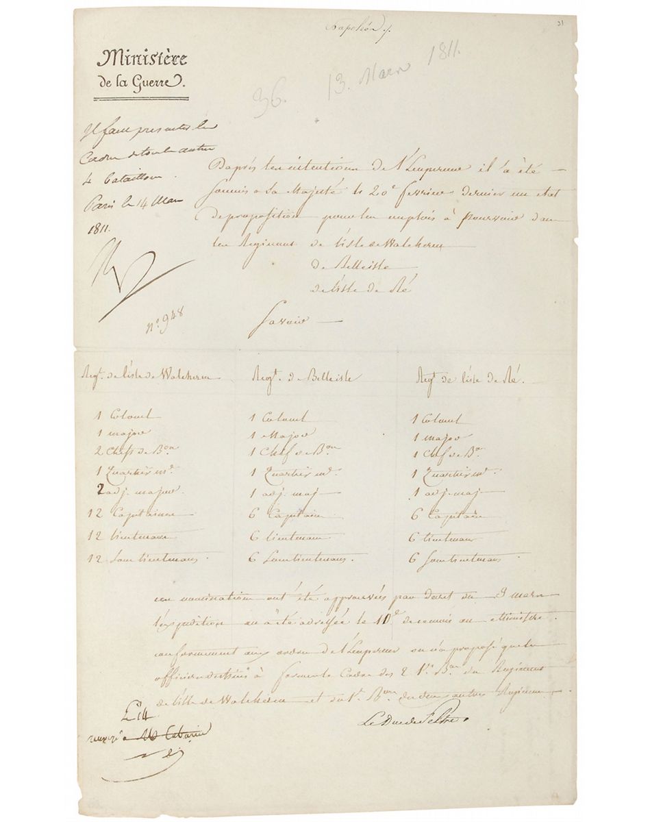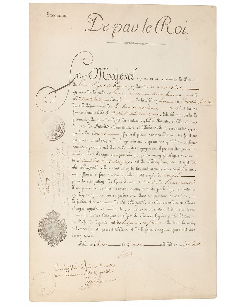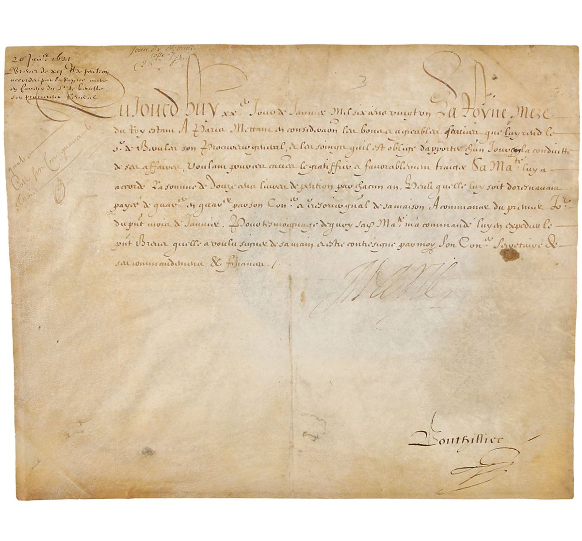 A one-of-a-kind set of 32 letters and documents, ranging in date from 1483 to 1873, signed by every French king and emperor from the time of King Louis XI to Napoleon III; the queens and empresses are also all present, beginning with Marie de Medici. Each piece has been professionally inlaid into a stunning leather-bound presentation book, each preceded by an inlaid engraved portrait of the ruler. Highlights of the collection include Catherine de’ Medici, Marie Antoinette, Napoleon Bonaparte, and the exceptionally rare Francis II. While most of the included pieces are documents and letters, there are several rare ALSs, most notably of Empress Josephine and Charles X. The book is arranged chronologically, and signers are (as they appear): Louis XI, DS on vellum dated 1483; Charles VIII, DS on vellum dated 1488; Louis XII, DS on vellum dated 1503; Francis I, LS to a European monarch dated 1528; Henry II, LS to the Duke d’Angouleme dated 1558; Catherine de' Medici, LS to her ambassador to Spain dated 1566; Francis II, DS on vellum dated 1560; Charles IX, DS on vellum dated 1562, signed by Charles at the age of twelve; Henry III, DS on vellum dated 1585; Henry IV, LS dated just 40 days before his assassination in 1610; Marie de’ Medici, DS on vellum dated 1621; Louis XIII, an important DS enumerating an inventory of royal tapestries, dated 1621; Anne of Austria, LS with an autograph subscription dated 1644; Louis XIV, DS with the addition of “Bon,” dated 1713; Maria Theresa of Spain, DS on vellum; Philippe II Duke of Orleans, LS with an eight-line autograph subscription; Françoise Marie de Bourbon, DS on vellum dated 1724; Louis XV, LS to a European monarch, dated 1727; Marie Leszczynska, LS to a cardinal dated 1728; Louis XVI, DS dated 1791; Marie Antoinette, DS with the addition of “payez,” dated 1785; Napoleon Bonaparte, letter from the Duke of Feltre endorsed by Napoleon, dated 1811; Josephine de Beauharnais, ALS signed “Lapagerie Bonaparte” circa 1800; Marie Louise of Austria, DS as Empress of France, dated 1812; Louis XVIII, DS dated 1818; Marie Josephine of Savoy, DS on vellum dated 1781; Charles X, undated ALS written as king, 1824-1830; Maria Theresa of Savoy, DS on vellum dated 1781; Louis-Philippe I, ALS in English dated 1804; Maria Amalia of Naples and Sicily, ALS dated 1822; Napoleon III, LS dated 1861; and Eugenie de Montijo, ALS dated 1873. The book measures a substantial 14 x 19 and is housed in a matching custom-made clamshell case. In overall very good to fine condition.