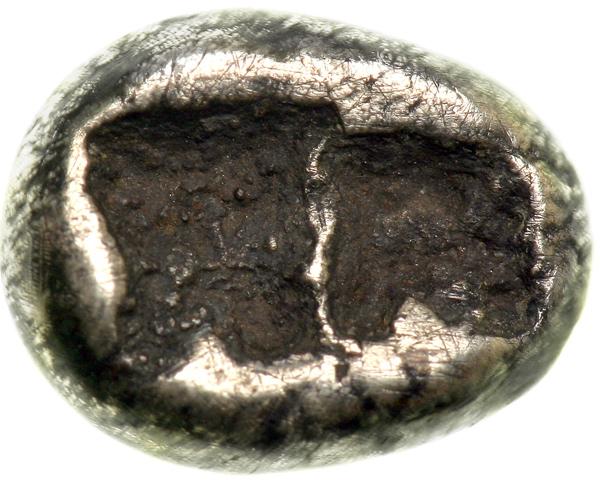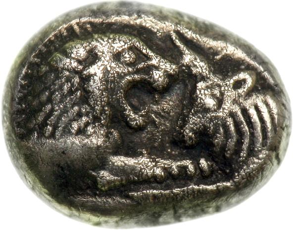 Kings of Lydia. Kroisos, c. 561-546 BC. AR Sixth Siglos (1.67 g). Confronted foreparts of lion and bull. Reverse: Two incuse punches. Rosen 667. Somewhat porous, but well detailed. Choice Very Fine. .