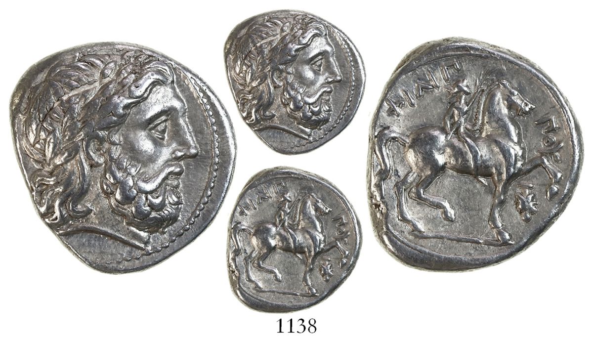 Kings of Macedon, AR tetradrachm, Philip II (359-336 BC), lifetime or early posthumous issue of Amphipolis, ca. 340/36-328 BC. Le Rider 263–325; SNG ANS 510–20. 14.38 grams. Laureate head of Zeus right / Naked youth on horseback right, holding palm in right hand and reins in left; to right, janiform head below raised foreleg. Well-detailed AU with full but slightly off-center head of ruler.