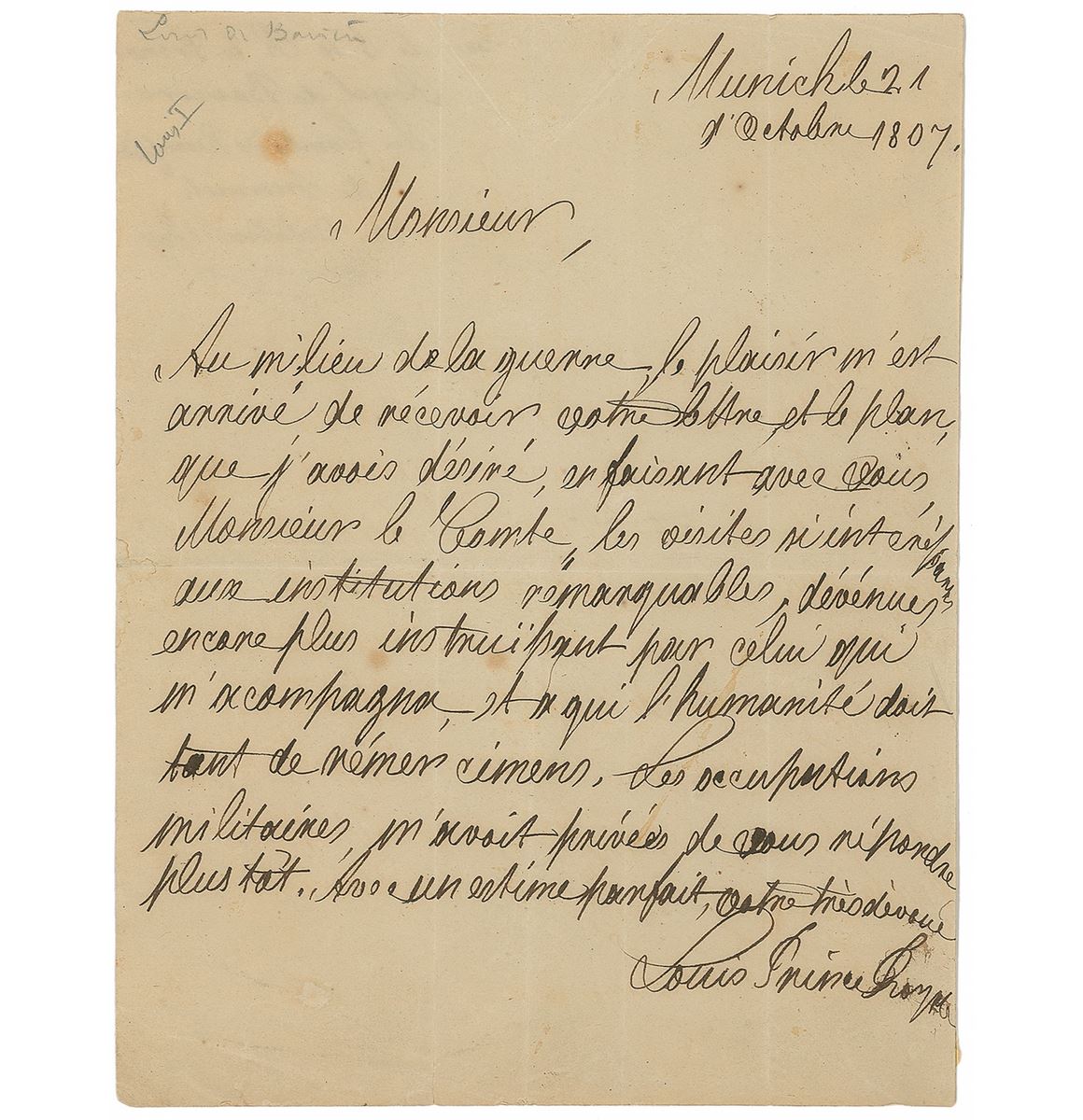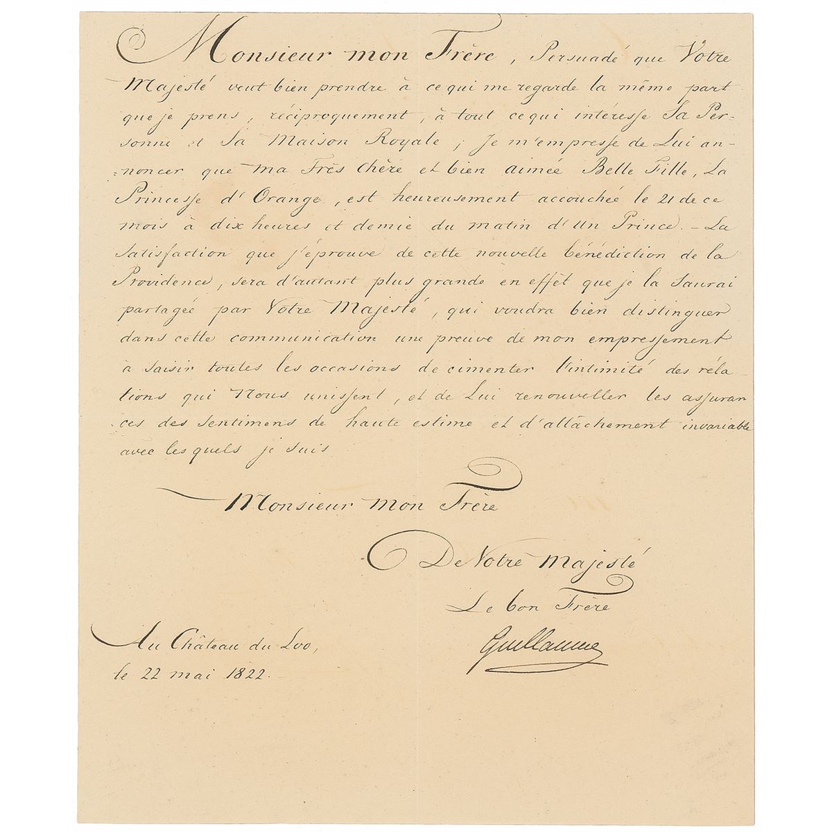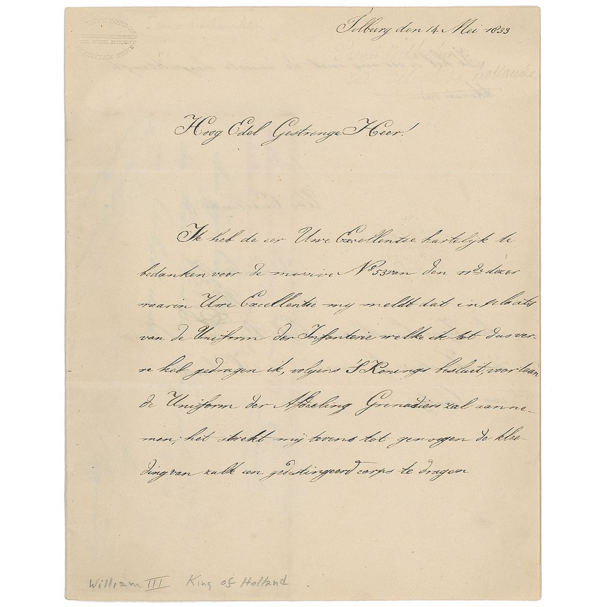 Collection of three letters from different 19th-century kings, including: an ALS from Louis I, King of Bavaria, dated October 21, 1807, and signed “Louis Prince Royale”; an LS from William I, King of the Netherlands and Grand Duke of Luxembourg, dated May 22, 1822, and signed “Guillaume”; and an ALS from William III, King of the Netherlands and Grand Duke of Luxembourg, dated May, 14, 1833 (as Prince of Orange), and signed, “Willem.” In overall very good to fine condition.