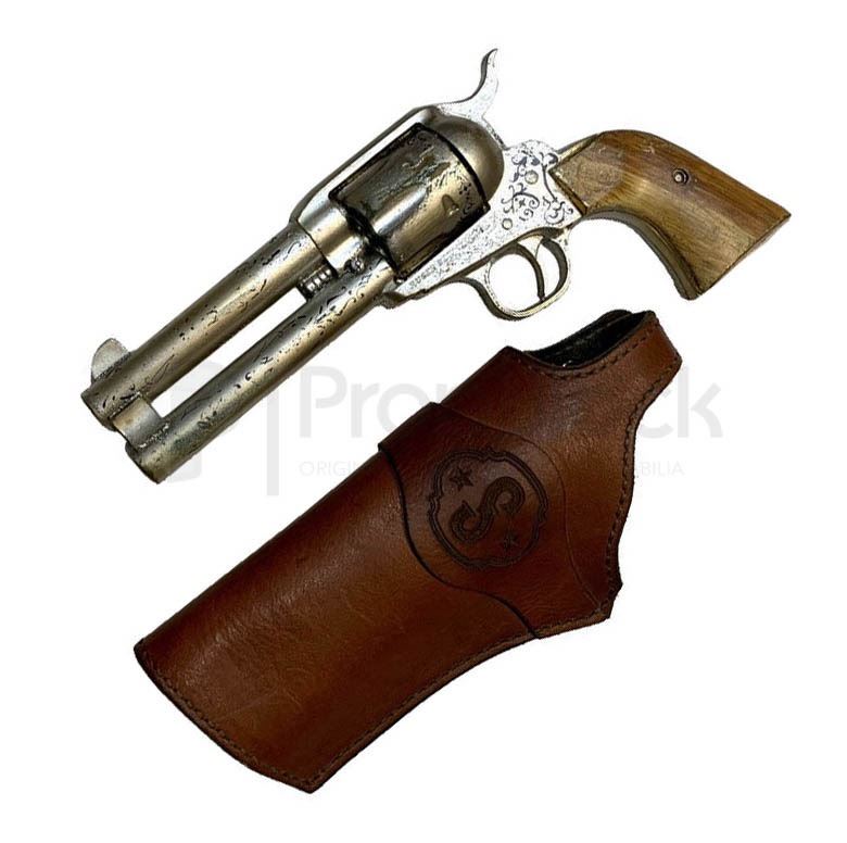 Double barrel revolver and holster used by the character of Agent Whiskey, actor Pedro Pascal in the 2017 spy thriller Kingsman: Agents of Shield. After the Kingsman's headquarters are destroyed and the world is held hostage, an allied spy organization in the United States is discovered. These two elite secret organizations must band together to defeat a common enemy. This is a stunt version of the gun, made of a dense urethane rubber and features a real brown leather holster. This piece remains in excellent, production used condition.
