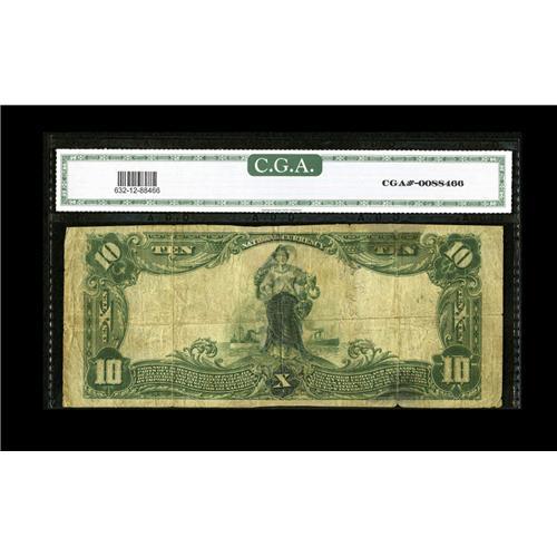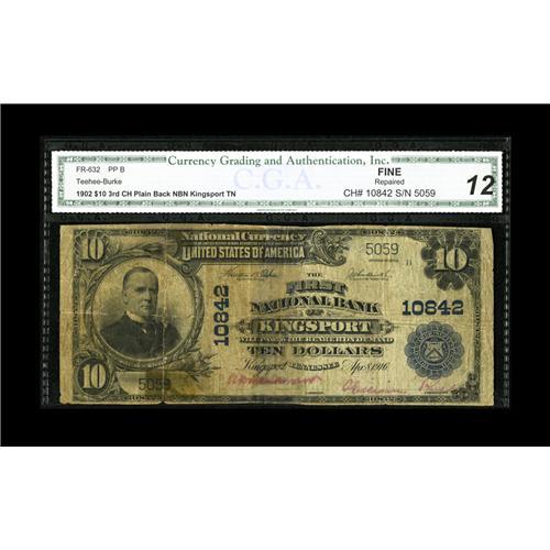 <B>Kingsport, TN</B></I> - $10 1902 Plain Back Fr. 632 <B>The First NB</B></I> Ch. # 10842<BR>You can add this note to the 3 Large known on this bank. This $10 has red signatures of A.D. Brockman and William Roller. <B>CGA Fine 12,</B></I> repaired.