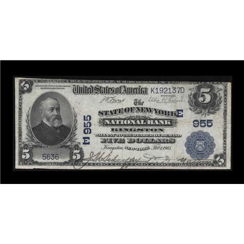 <B>Kingston, NY</B></I> - $5 1902 Plain Back Fr. 598 <B>The State of New York NB</B></I> Ch. # (E)955<BR>A nice <B>Fine+</B></I> with stamped signatures and a bank title certainly designed to inspire confidence on the part of depositors. Although three of the face margins are more than ample, greater care might have been exercised with the top trim. While this is not a difficult community to locate, notes from this particular institution are quite another story, being more elusive than the census figures might indicate.