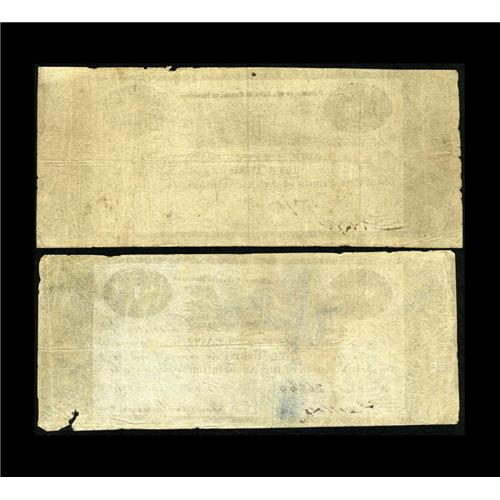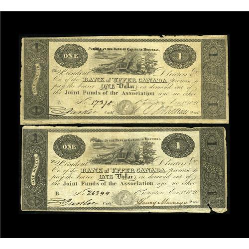 <B>Kingston, ON- Bank of Upper Canada</B></I> $1 Jan. 1, 1820 Ch. 765-12-02 Two Examples<BR>Both notes have the "Payable at the Bank of Canada in Montreal" black overprint. One notes grades <B>Fine</B></I> with corner damage and the other note grades <B>VG.</B></I><BR><I>From The Halton Lake Collection</B></I>