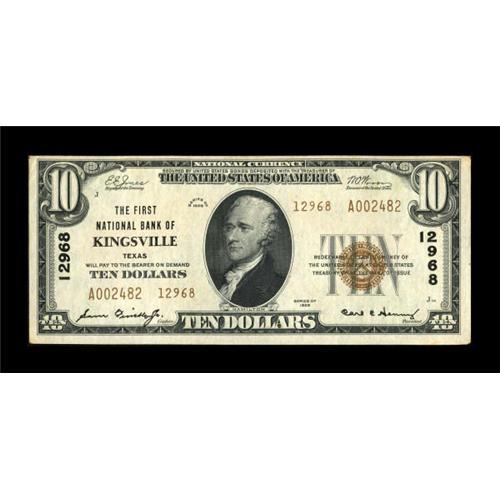 <B>Kingsville, TX</B></I> - $10 1929 Ty. 2 <B>The First NB</B></I> Ch. # 12968<BR> The paper is a touch aged and there are folds at two corner tips, but this south Texas note is fully <B>Uncirculated</B></I>.<BR><BR><b>Shipping:</b> Coins & Currency (<a target="_blank" href="http://www.heritageauctions.com/common/shipping.php">view shipping information</a>)