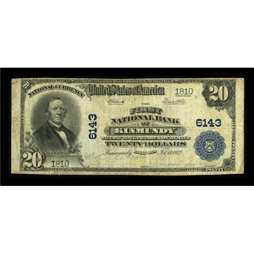 <B>Kinmundy, IL</B></I> - $20 1902 Plain Back Fr. 660 <B>The First NB</B></I> Ch. # 6143<BR>Stamped signatures still show up on this <B>Very Good-Fine</B></I> 1922 dated Plain Back. A few pinholes are noticed on lightly aged surfaces.<BR><I>From The Lincoln Collection</B></I><BR><BR><b>Shipping:</b> Coins & Currency (<a target="_blank" href="http://www.heritageauctions.com/common/shipping.php">view shipping information</a>)