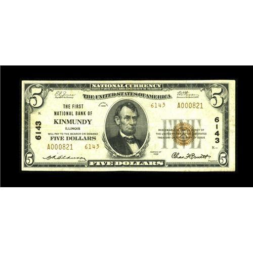 <B>Kinmundy, IL</B></I> - $5 1929 Ty. 2 <B>The First NB</B></I> Ch. # 6143<BR>This <B>Very Fine</B></I> note is only the second $5 Type 2 to be documented from here. We note a private offering of the other example, a Good-Very Good, in 2005 for $495. This much nicer piece is worth considerably more, likely in the range of...<BR><BR><b>Shipping:</b> Coin/Currency (<a target="_blank" href="http://www.heritageauctions.com/common/shipping.php">view shipping information</a>)