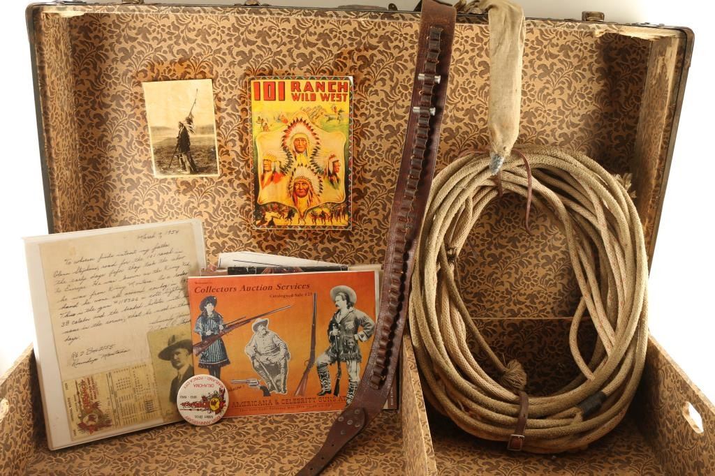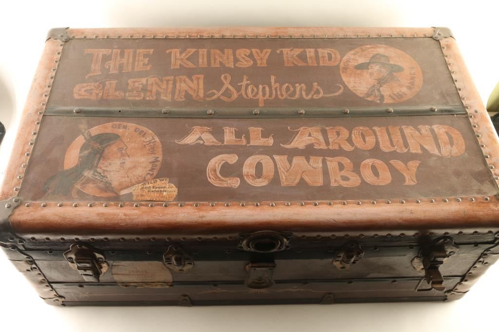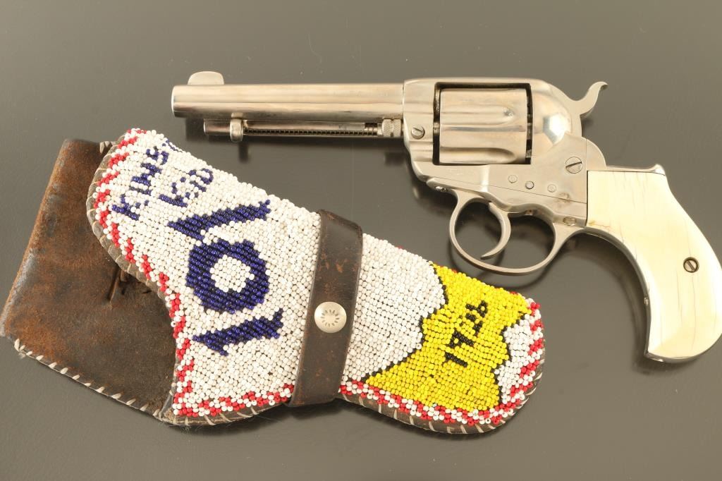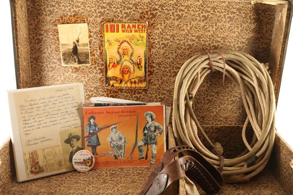 Collection of Western Memorabilia items related to the "Miller Brothers 101 Ranch" and the "101 Ranch Wild West Show" run by Joe Miller, oldest of the Miller Brothers. Items are associated with Glenn Stephens, known as the "Kinsy Kid" (because he was from Kinsy Montana), who rode for the 101 Ranch. #1) SN: 118326 Colt model 1877 "Lightning" 38 cal revolver features double action trigger, 4-1/2" barrel, fixed sights, nickel finish, two piece ivory grips, 6 shot fluted cylinder. Bore is fair to good condition, lightly frosted with sharp rifling. Appears refinished, with partial erosion of many markings, dishing around screw holes. Grips are good condition. Action operates smoothly with good lockup. Museum tag "693" attached to triggerguard. Condition is NRA Good - refinished *** Modern Firearm *** #2) Beaded Holster featuring leather construction, full coverage beaded face with blue on white "101 Kinsey Kid" and black on yellow "1926", with red/white bead pattern border. Condition is good with supple leather, no visible losses to beadwork. #3) Gunbelt - leather with cartridge loops, attributed to ownership of Glenn Stephens. #4) Documents Collection: - Letter from Jerry E. Murphey, noted 101 Ranch collector, dated December 5th 1997, describing the Colt Revolver & Holster as authentic. - Letter from Valma Stephens, Glenn Stephens' daughter, with brief bio info on her father, listing the revolver by serial number and describing the holster. Letter is laminated, enclosed in the lamination are a postcard featuring Joe Miller, and a 101 Ranch Wild West Show route card for 1926. - Extracts from a previous auction (1990's) listing the revolver, gun belt & holster, with the above documents. - Auction catalog from 2006 with listing and photograph of all above items, plus the later addition of a storage and travel trunk and other items. #5) Kinsy Kid decorated trunk, featuring lid graphics and old photos inside the lid, in keeping with the description given of Glenn Stephens being named "All Around Cowboy" in 1936. The trunk is in fair condition overall, working hinges & latches, leather handles dry and rotted, has an even treatment of a dark color stain to accentuate the look of age. Includes an older coiled ropein fair condition.