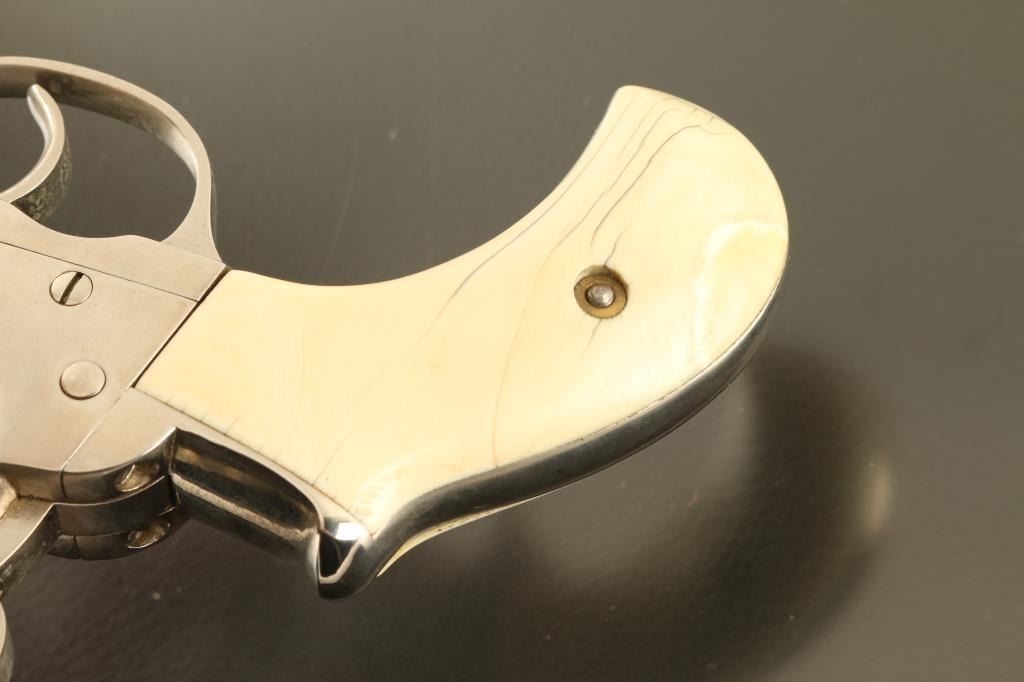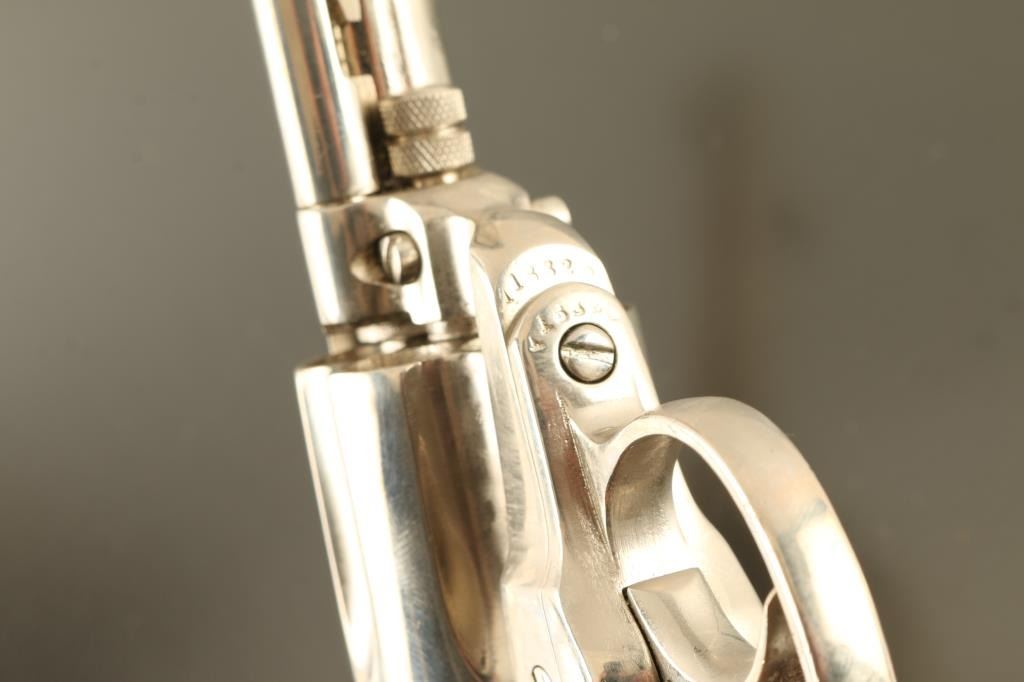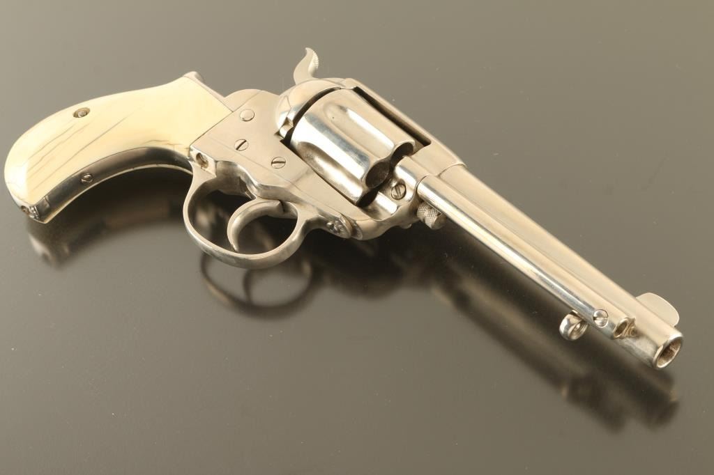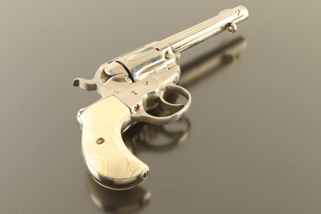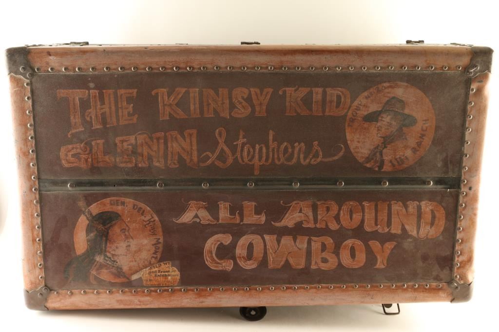 Collection of Western Memorabilia items related to the "Miller Brothers 101 Ranch" and the "101 Ranch Wild West Show" run by Joe Miller, oldest of the Miller Brothers. Items are associated with Glenn Stephens, known as the "Kinsy Kid" (because he was from Kinsy Montana), who rode for the 101 Ranch. #1) SN: 118326 Colt model 1877 "Lightning" 38 cal revolver features double action trigger, 4-1/2" barrel, fixed sights, nickel finish, two piece ivory grips, 6 shot fluted cylinder. Bore is fair to good condition, lightly frosted with sharp rifling. Appears refinished, with partial erosion of many markings, dishing around screw holes. Grips are good condition. Action operates smoothly with good lockup. Museum tag "693" attached to triggerguard. Condition is NRA Good - refinished *** Modern Firearm *** #2) Beaded Holster featuring leather construction, full coverage beaded face with blue on white "101 Kinsey Kid" and black on yellow "1926", with red/white bead pattern border. Condition is good with supple leather, no visible losses to beadwork. #3) Gunbelt - leather with cartridge loops, attributed to ownership of Glenn Stephens. #4) Documents Collection: - Letter from Jerry E. Murphey, noted 101 Ranch collector, dated December 5th 1997, describing the Colt Revolver & Holster as authentic. - Letter from Valma Stephens, Glenn Stephens' daughter, with brief bio info on her father, listing the revolver by serial number and describing the holster. Letter is laminated, enclosed in the lamination are a postcard featuring Joe Miller, and a 101 Ranch Wild West Show route card for 1926. - Extracts from a previous auction (1990's) listing the revolver, gun belt & holster, with the above documents. - Auction catalog from 2006 with listing and photograph of all above items, plus the later addition of a storage and travel trunk and other items. #5) Kinsy Kid decorated trunk, featuring lid graphics and old photos inside the lid, in keeping with the description given of Glenn Stephens being named "All Around Cowboy" in 1936. The trunk is in fair condition overall, working hinges & latches, leather handles dry and rotted, has an even treatment of a dark color stain to accentuate the look of age. Includes an older coiled ropein fair condition.